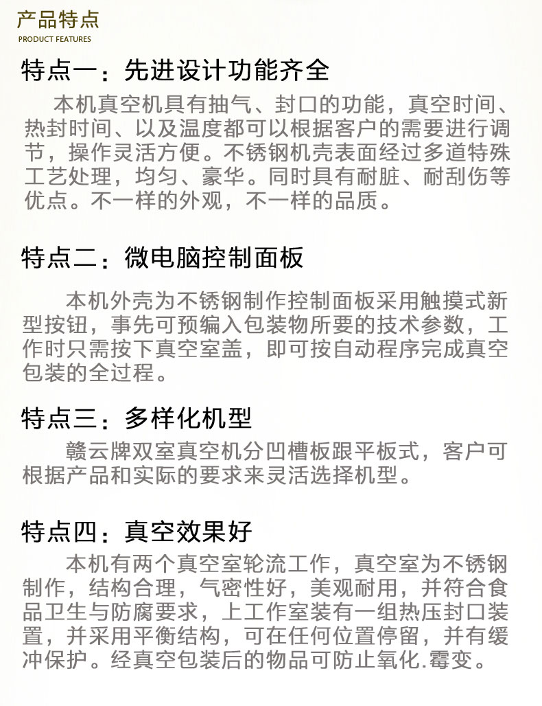 贛云牌真空包裝機(jī)是一種新穎的包裝機(jī)械,它是將包裝袋內(nèi)抽成真空后、立即自動封口,袋內(nèi)真空度高,殘留空氣少,防止了細(xì)菌等微生物的繁殖、避免了物品氧化霉變和腐敗、同時對某些松軟的物品、經(jīng)人包裝后、可縮小包裝體積、便于運(yùn)輸和貯存。