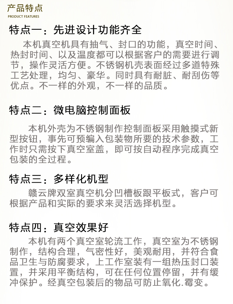 贛云牌真空包裝機是一種新穎的包裝機械,它是將包裝袋內抽成真空后、立即自動封口,袋內真空度高,殘留空氣少,防止了細菌等微生物的繁殖、避免了物品氧化霉變和腐敗、同時對某些松軟的物品、經人包裝后、可縮小包裝體積、便于運輸和貯存。