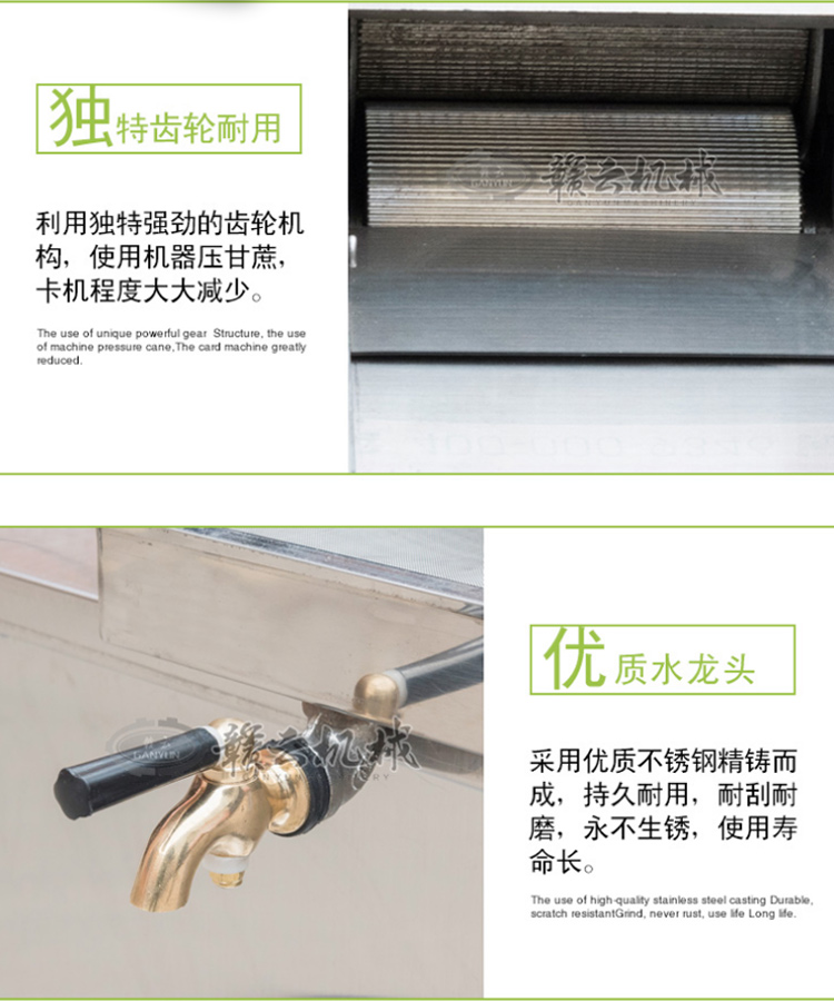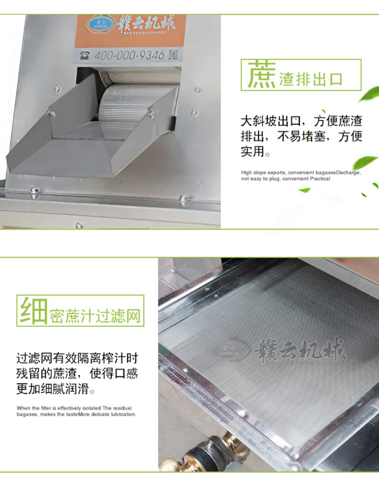 贛云系列電動(dòng)甘蔗榨汁機(jī)用于榨甘蔗汁和水果榨汁之用,采用壓榨原理將甘蔗汁和甘蔗渣分離出來,也可稱為甘蔗榨汁分離機(jī),榨出來的甘蔗汁味到甜美,營養(yǎng)豐富,榨汁率高達(dá)95%以上。