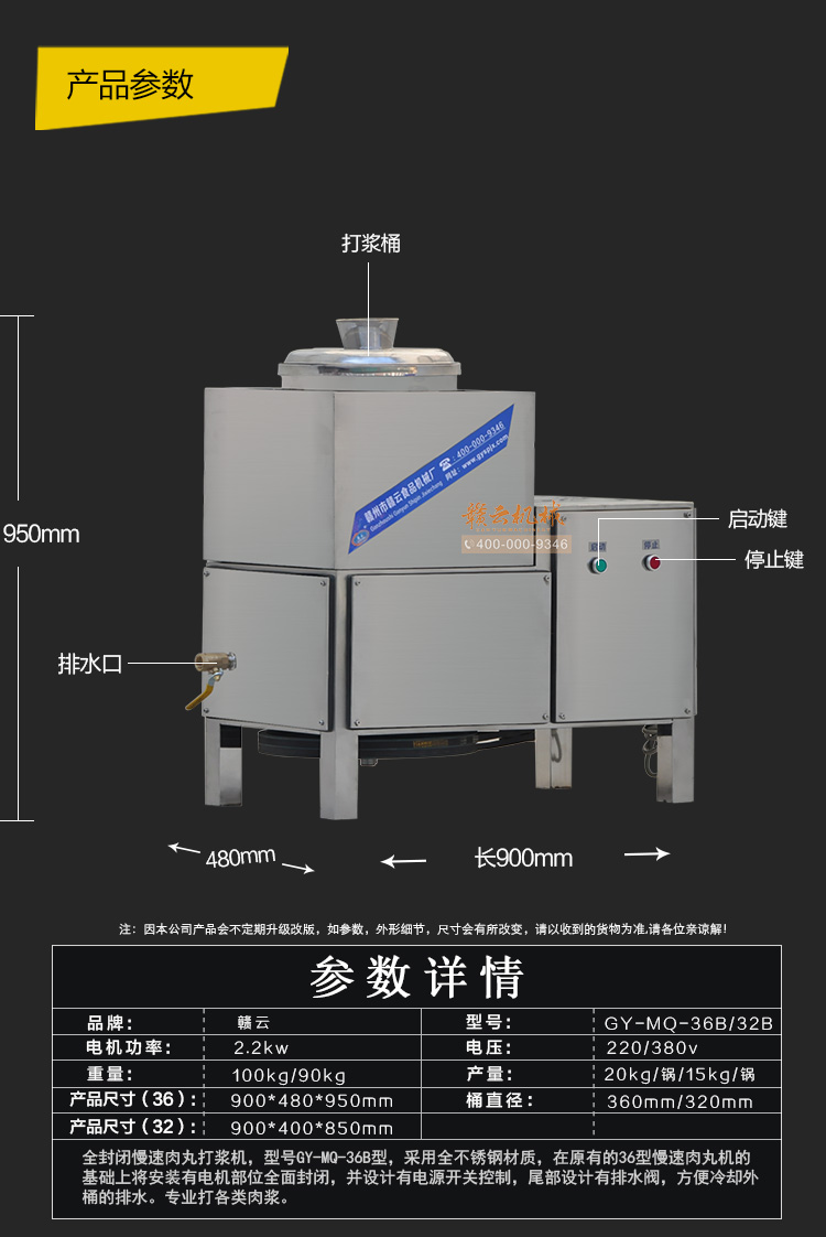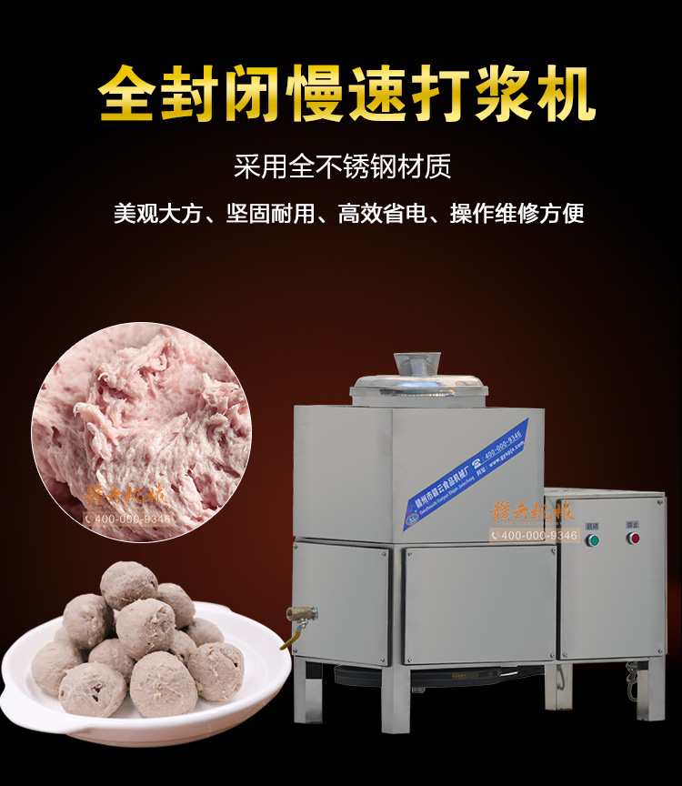 款全封閉慢速肉丸打漿機,型號GY-MQ-32B型,采用全不銹鋼材質(zhì),在原有的32型慢速肉丸機的基礎(chǔ)上將安裝有電機部位全面封閉,并設(shè)計有電源開關(guān)控制,尾部設(shè)計有排水閥,方便冷卻外桶的排水,以全新的面貌上市。贛州市贛云食品機械廠,致力于打造魚肉丸加工設(shè)備影響力企業(yè)之一!