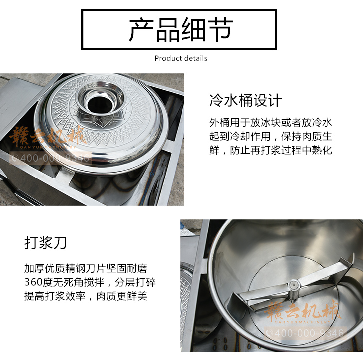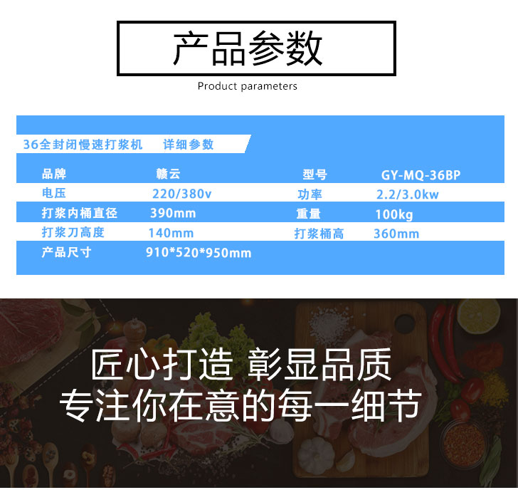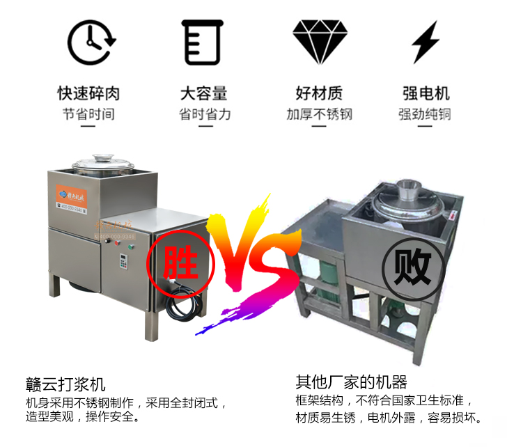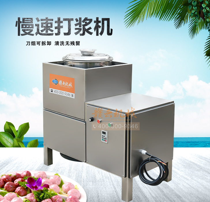 贛云牌36型全封閉式慢速變頻肉丸打漿機選優(yōu)質不銹鋼,在全不銹鋼慢速肉丸打漿機基礎上將整機外殼用不銹鋼板材封裝,更好的保護電動機,通過小皮帶輪帶動大皮帶輪減速,慢速拍打肉漿。