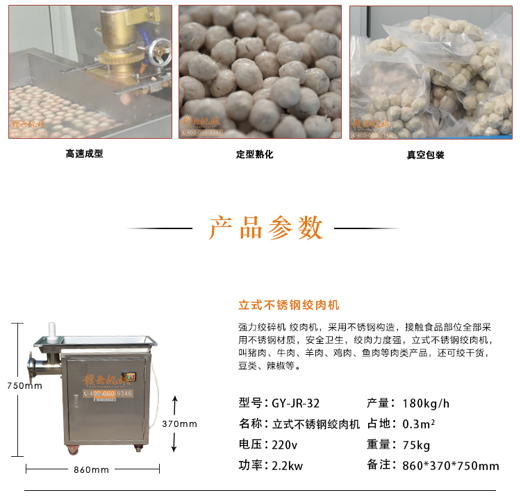 帶真空包裝新鮮豬肉丸,帶魚(yú)刺感魚(yú)丸生產(chǎn)成套設(shè)備,本套設(shè)備采用32立式不銹鋼絞肉機(jī)、28型全封閉高速肉丸打漿機(jī)、160型加高肉丸成型機(jī)、1500型智能溫控雙加熱水槽和4201型單室真空包裝機(jī)組合而成,可生產(chǎn)新鮮豬肉丸、實(shí)心魚(yú)丸、素丸子等小產(chǎn)量加工成型