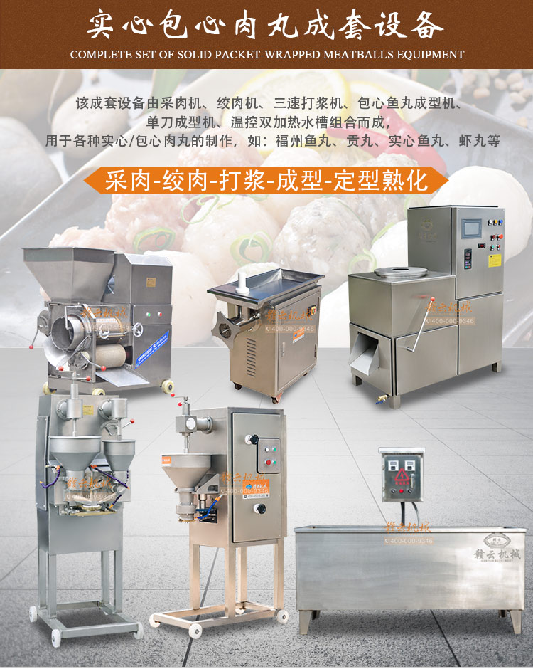 實心肉丸成套設(shè)備,包心肉丸成套設(shè)備一體組合,能生產(chǎn)新鮮各式實心肉丸,包心肉丸,如實心豬肉丸、魚丸,潮汕牛肉丸,蝦丸蟹丸等各種實心丸子,及福州魚丸、包心豬肉丸,包心牛肉丸等各式包心肉丸等,本套設(shè)備有絞肉機、采肉機、制冷三速打漿機、單刀高速多功能成型機、包心肉丸成型機和熟化水槽。