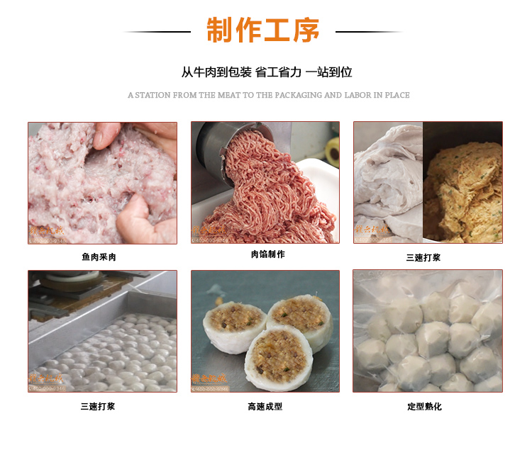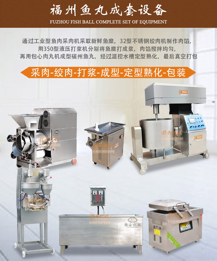 福州魚丸成套設備,時產500kg配套組合,采用新鮮淡水魚或海魚為原料加工,通過350工業(yè)型魚肉采肉機采取新鮮魚糜,用350型液壓打漿機調制成漿,32型不銹鋼絞肉機制作肉餡,用第三代包心肉丸機成型福州魚丸,后經過熟化定型水槽定型熟化