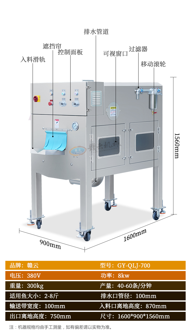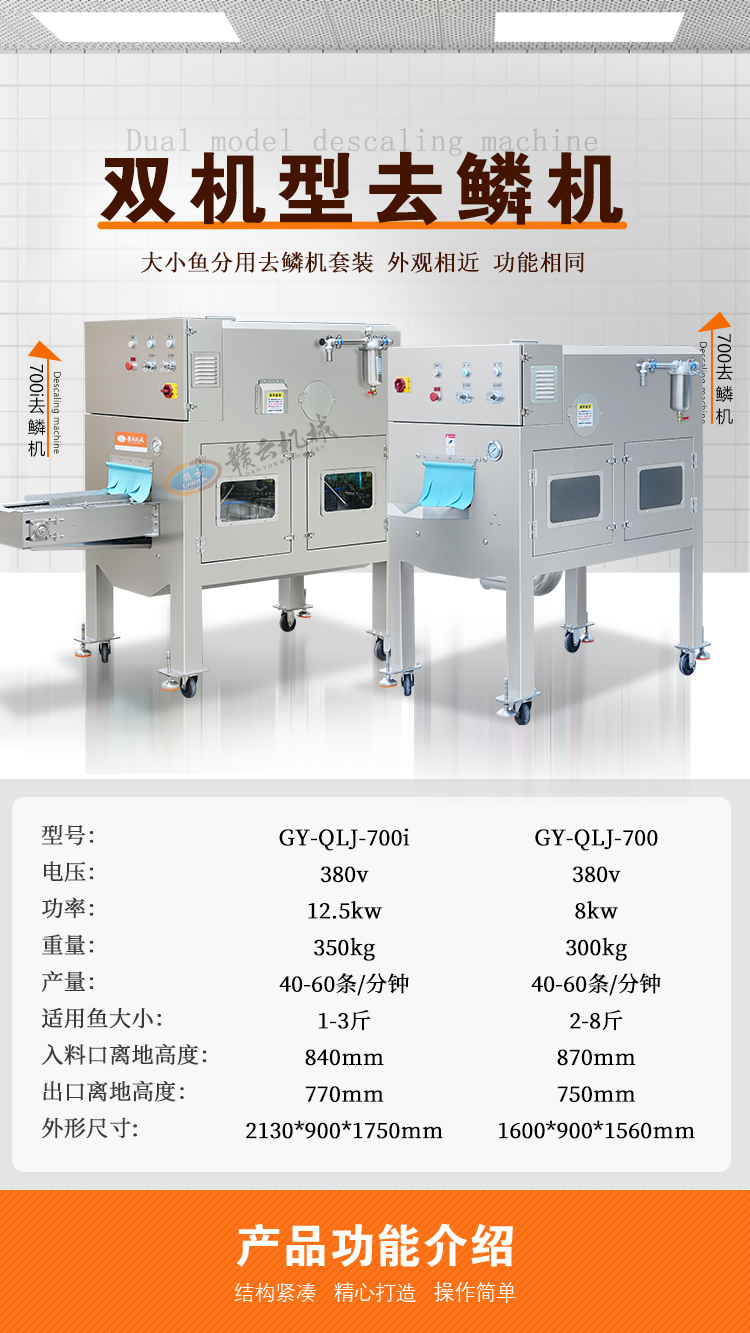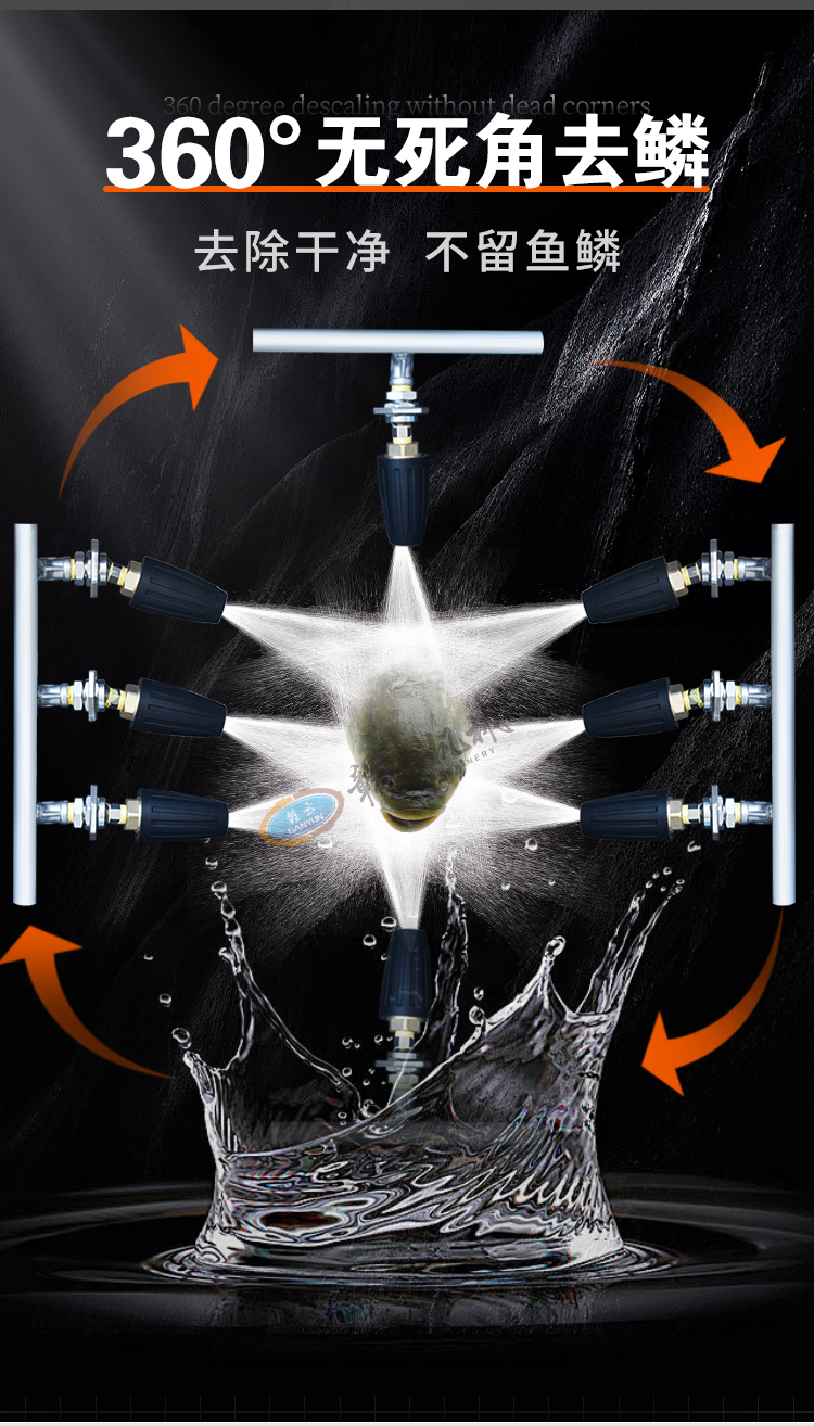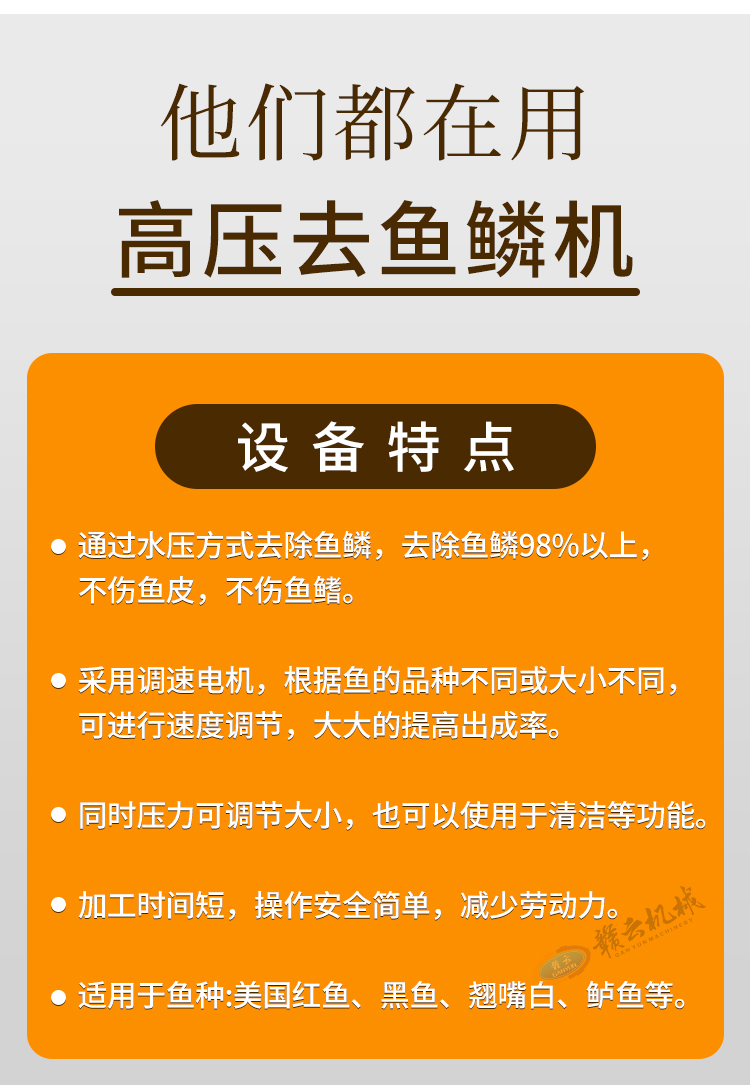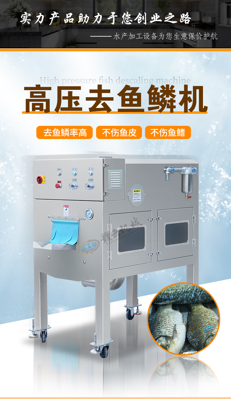 贛云高壓去魚鱗機通過高壓水流的方式將活魚表面的魚鱗沖刷去除干凈,不傷魚皮、不傷魚鰭,可以連續(xù)式操作,提高了去魚鱗的效率,降低了人工成本。去魚鱗機操作簡單,相比傳統(tǒng)人工去魚鱗的耗時耗力效率低下,還需要有經(jīng)驗的刀工技術(shù),使用這臺設(shè)備只需要通過簡單的操作,就可以輕松去除魚鱗。整機采用食品級不銹鋼材質(zhì),設(shè)備整體操作簡單、去魚鱗干凈、加工效率高、適用于多種魚類,并且采用水作為去魚鱗介質(zhì),不會對魚肉造成污染。