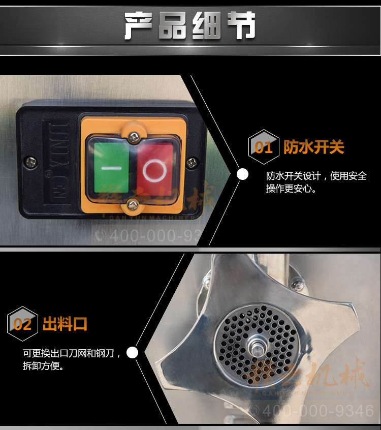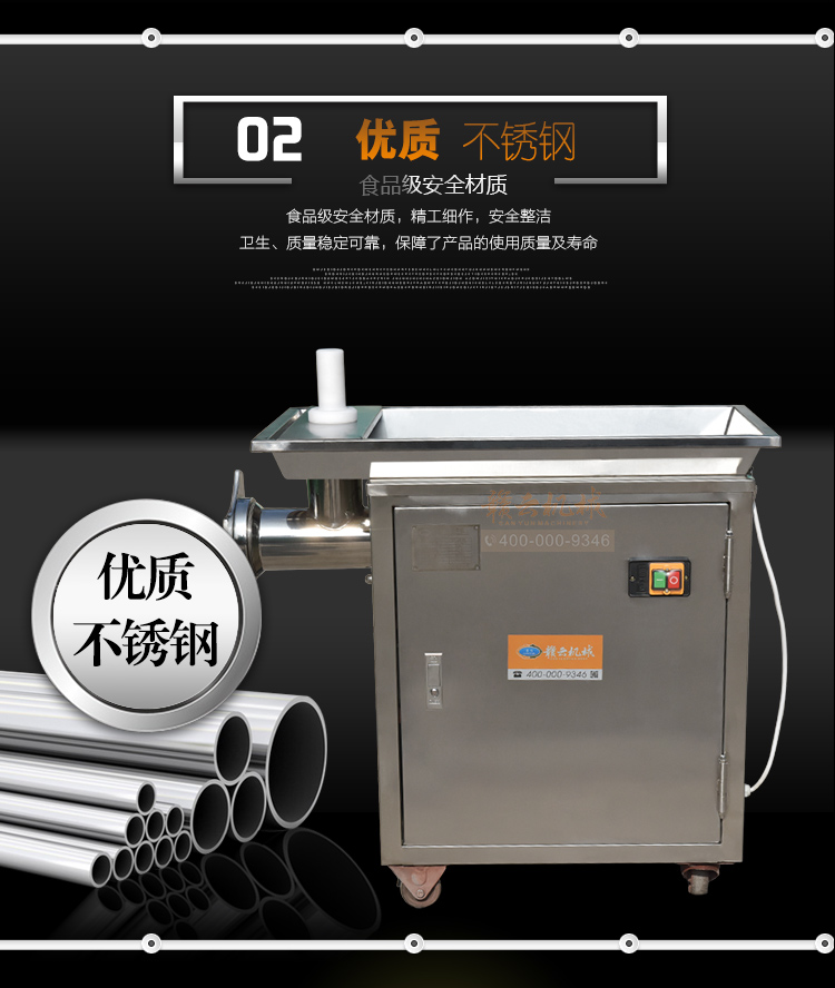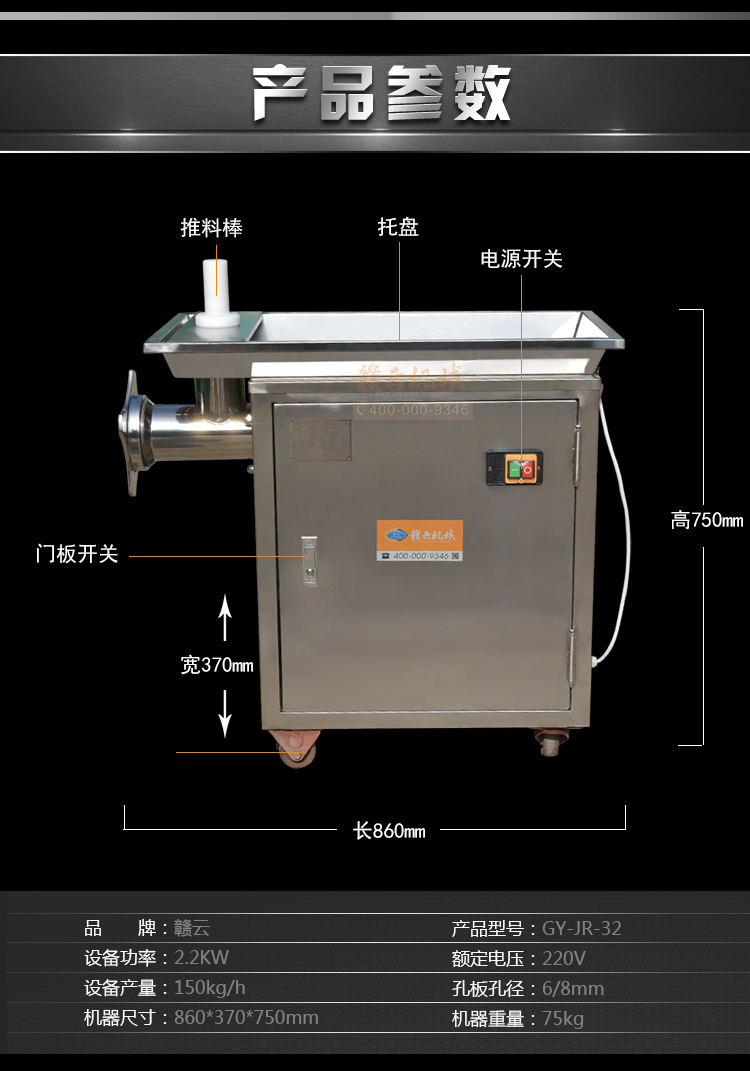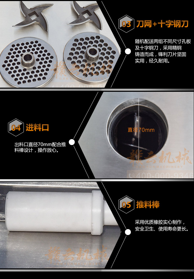 贛云牌32型不銹鋼立式絞肉機,防水開關,二級減速,齒輪鏈條傳動,接觸食品部位全部不銹鋼材質,配6mm、8mm刀網(wǎng),兩個十字刀,并配實心推料棒!絞肉就是不一樣。
