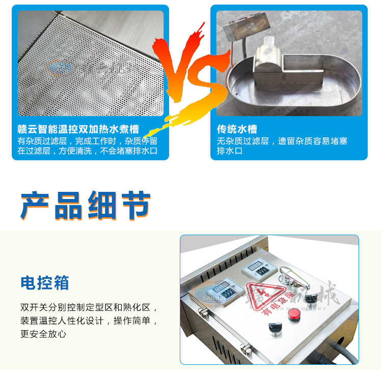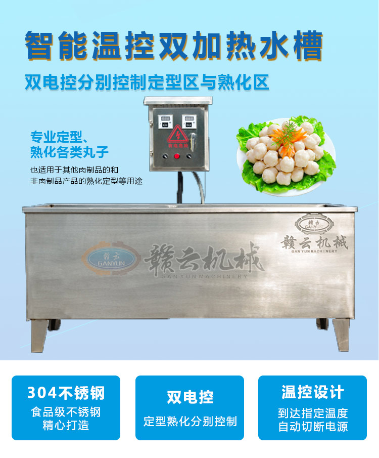 整機(jī)采用304不銹鋼板材設(shè)計(jì),中間采用發(fā)泡劑,取保溫隔熱作用,雙槽加熱,獨(dú)立控制,定型熟化分別控制,加熱速度快,省電更省心。本產(chǎn)品量身設(shè)計(jì)可配套用于我廠生產(chǎn)的包心肉丸機(jī)、牛肉貢丸機(jī)、墨魚(yú)丸成型機(jī)、獅子頭成型機(jī)、雙調(diào)速肉丸機(jī)、火鍋丸子機(jī)組等多種肉丸成型設(shè)備使用??杉佑停糜谟驼ㄍ枳拥亩ㄐ褪旎?,可加水,用于各種肉丸的定型熟化,根據(jù)其加熱作用原理,也適用于其他肉制品的和非肉制品產(chǎn)品的熟化定型等用途。