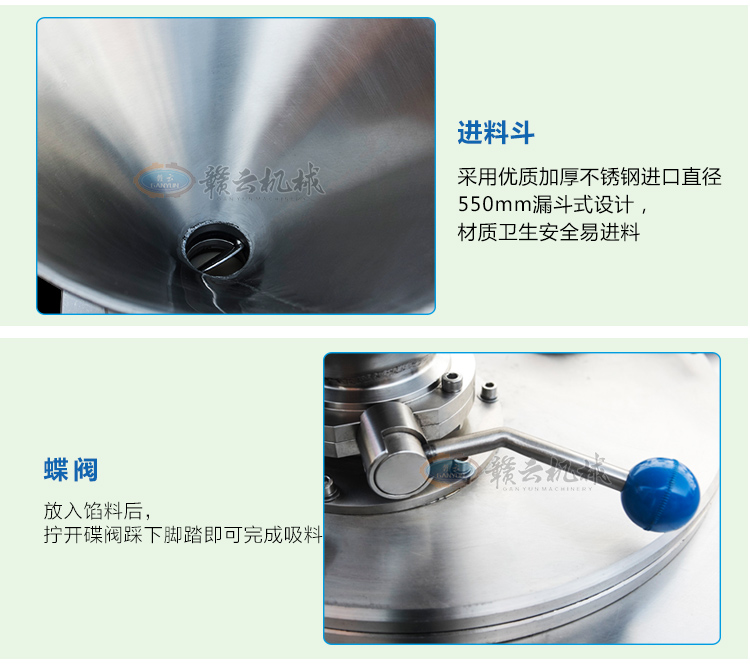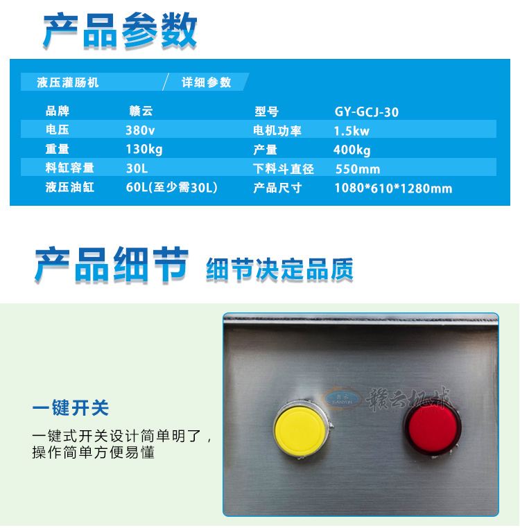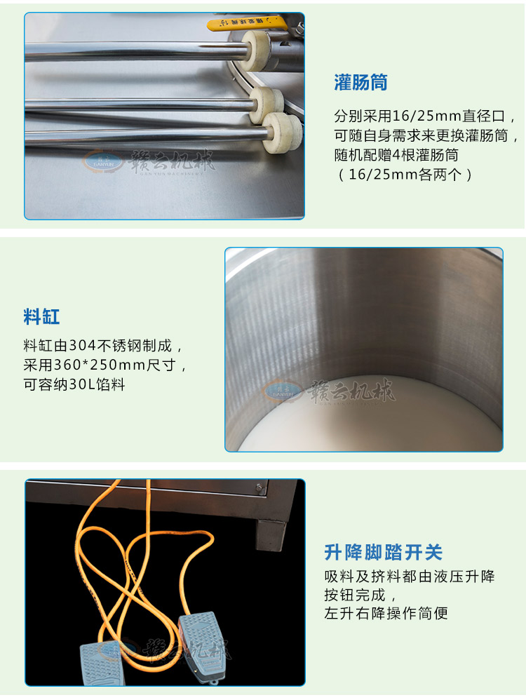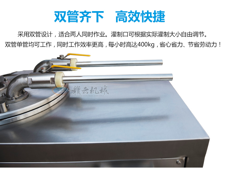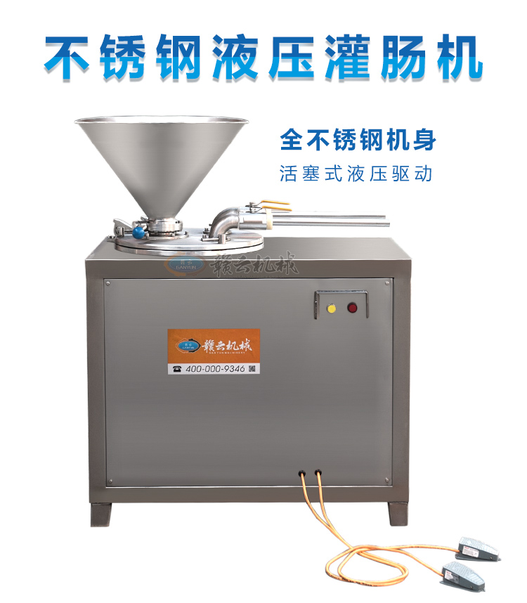 贛云液壓灌腸機,新款灌漿機,雙管灌腸機采用液壓灌漿推料原理設計,密封性能良好,配合雙管灌漿,可自動調(diào)節(jié)灌漿,自動吸料,腳踏開關控制操縱自如。是腸類灌腸設備。