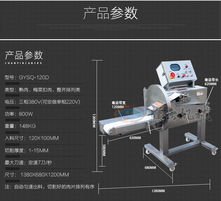GYSQ-120D切熟肉機(jī),專業(yè)切熟肉機(jī)可切扣肉、鹵豬耳朵、五花肉等,通過調(diào)整輸送帶的速度控制切割厚度,輸送帶越快厚度越厚,越慢越薄。適用于食堂、中央廚房、餐飲配送中心、肉聯(lián)廠、大型酒店等。變頻電控箱,通過調(diào)節(jié)輸送帶速度控制切割厚度,按鍵防水設(shè)計,可拆卸輸送帶。優(yōu)質(zhì)刀片,杜絕卷刃。
