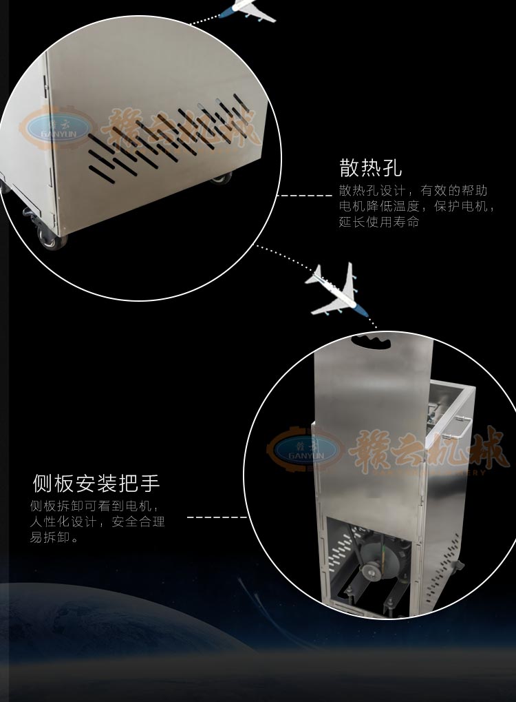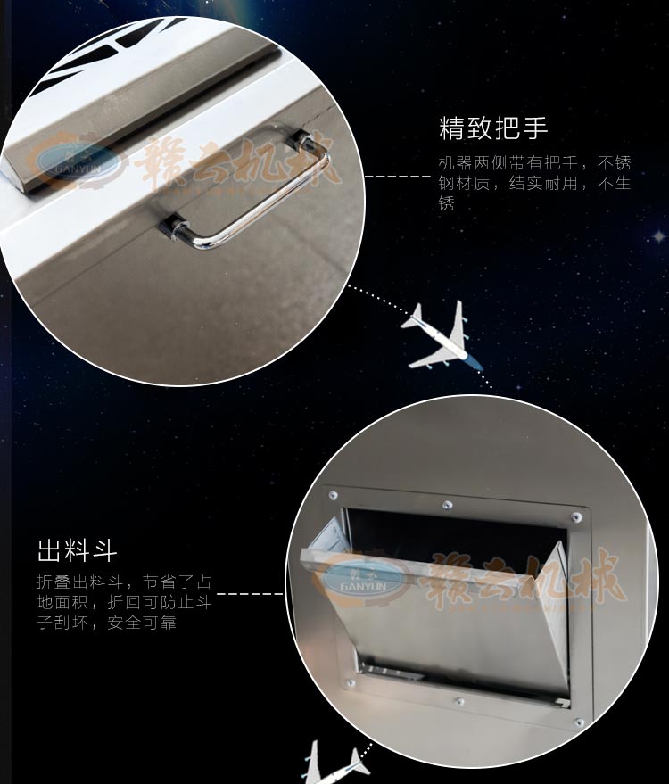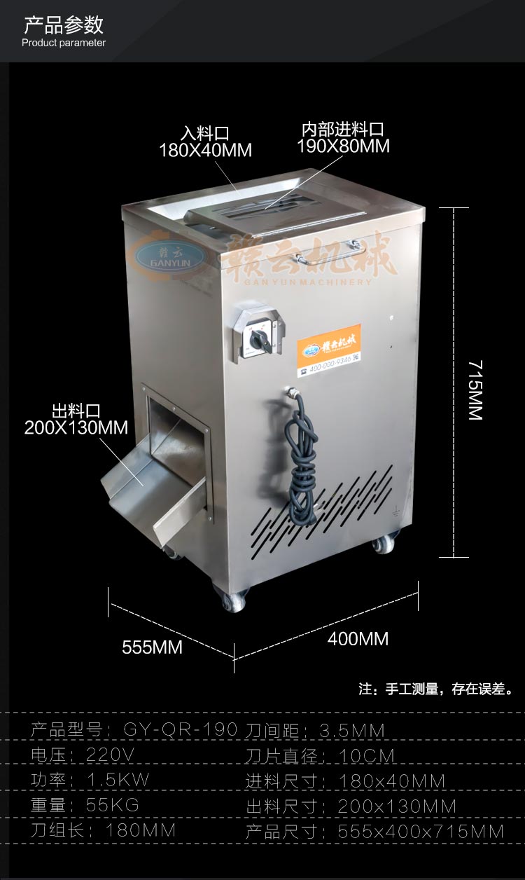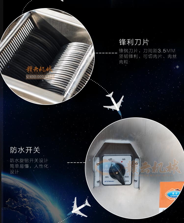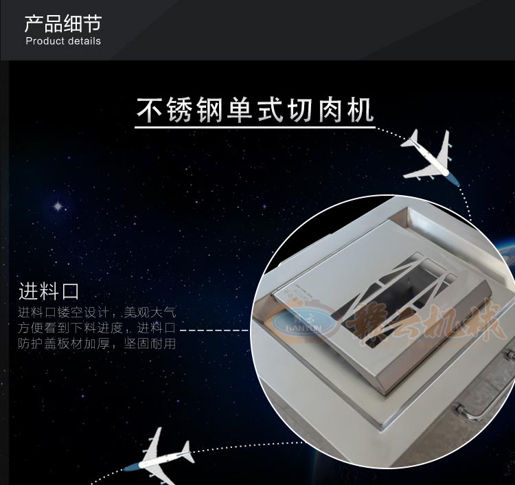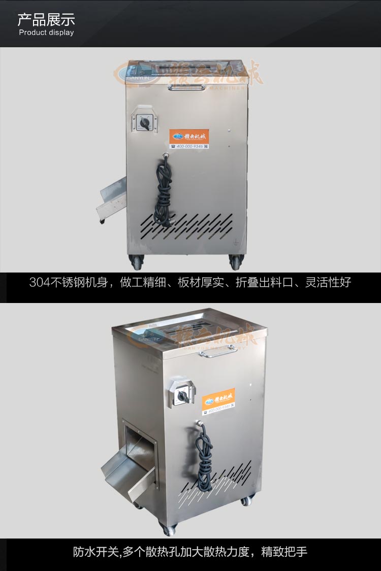 不銹鋼切肉機不銹鋼切肉機,進料口鏤空設(shè)計,方便看到下料進度,進料口防護蓋板材加厚,堅固耐用。鋒利刀片,刀間距3.5mm,切切肉片、肉絲、肉粒。防水旋鈕開關(guān)。折疊出料口,節(jié)省空間,推回可防止料斗刮壞。側(cè)板拆卸可看到電機。304不銹鋼機身,兩個萬向輪,兩個非萬向輪,容易固定,省心。