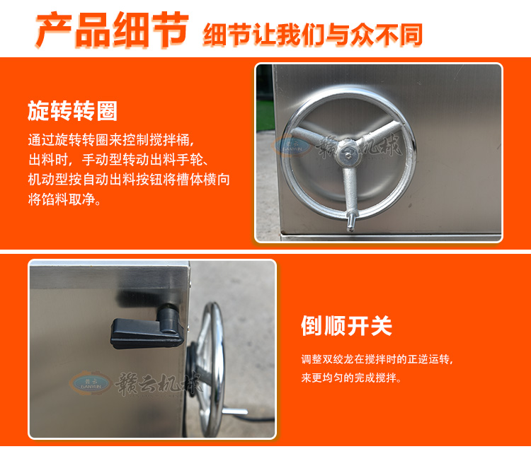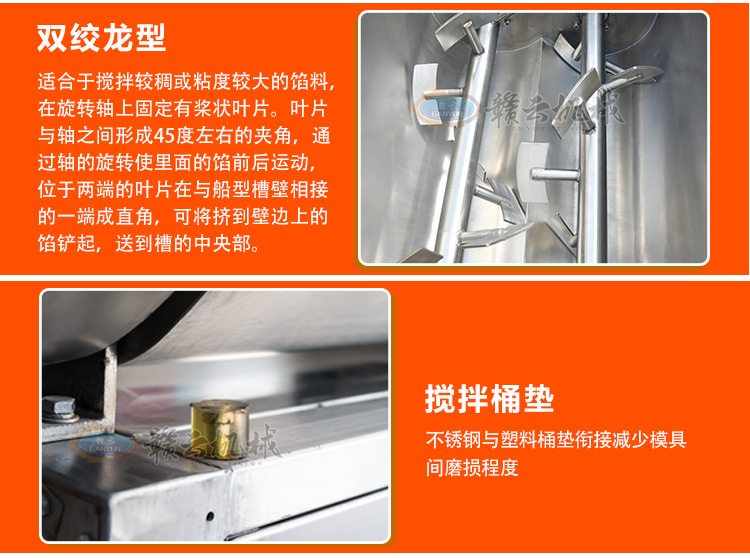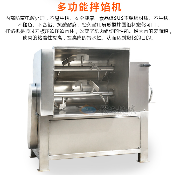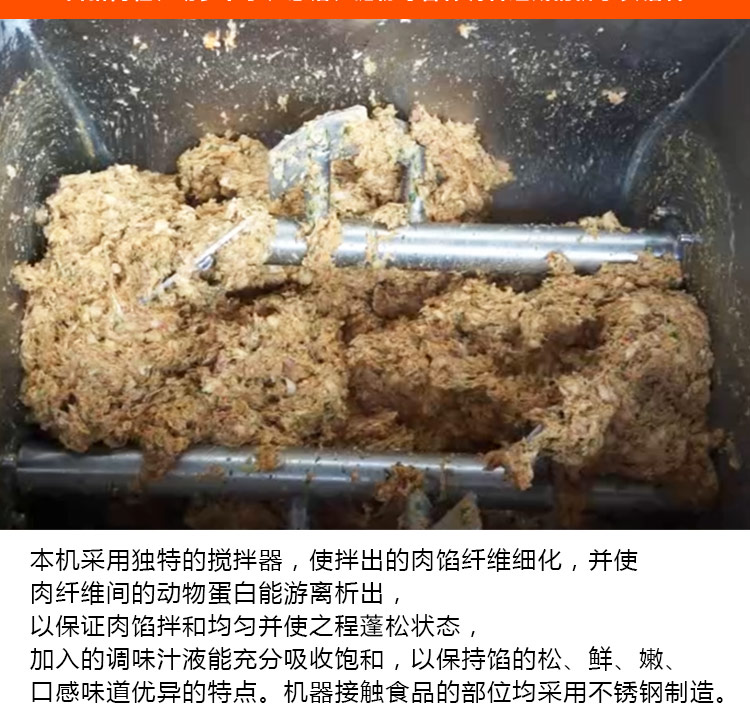 本機采用304不銹鋼材質(zhì)設(shè)計,符合食品衛(wèi)生加工需求,絞龍型攪拌鋼軸可向內(nèi)向外雙向攪拌旋轉(zhuǎn)運動,由倒順開關(guān)控制攪拌方向,適合粘稠度較大物料的攪拌,攪拌過程還對肉質(zhì)起嫩化效果,是肉餡、肉醬、菜餡等攪拌的上好設(shè)備。