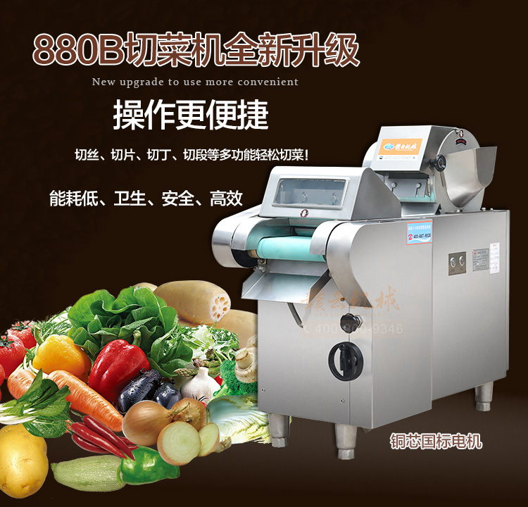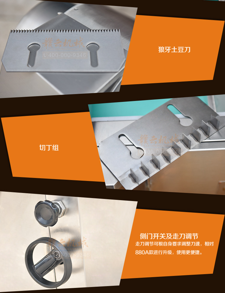 贛云880B型切菜機(jī),采用標(biāo)準(zhǔn)不銹鋼板材加工設(shè)計(jì),做工精細(xì),外形美觀大方,利用齒輪偏心設(shè)計(jì)手動旋鈕便攜可調(diào)走刀量,在原880A型切菜機(jī)基礎(chǔ)上改良設(shè)計(jì)而成,解決多功能切菜機(jī)手動走刀量調(diào)節(jié)問題,是食堂,企業(yè)單位、酒店廚房多樣切菜設(shè)備。