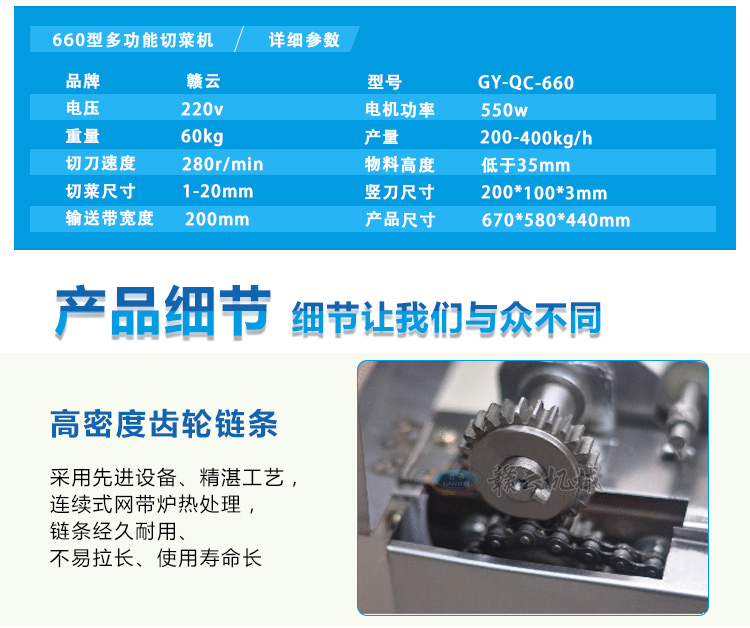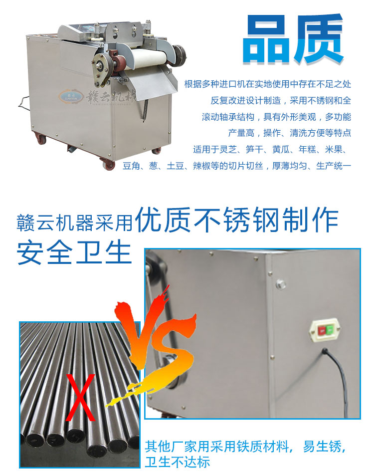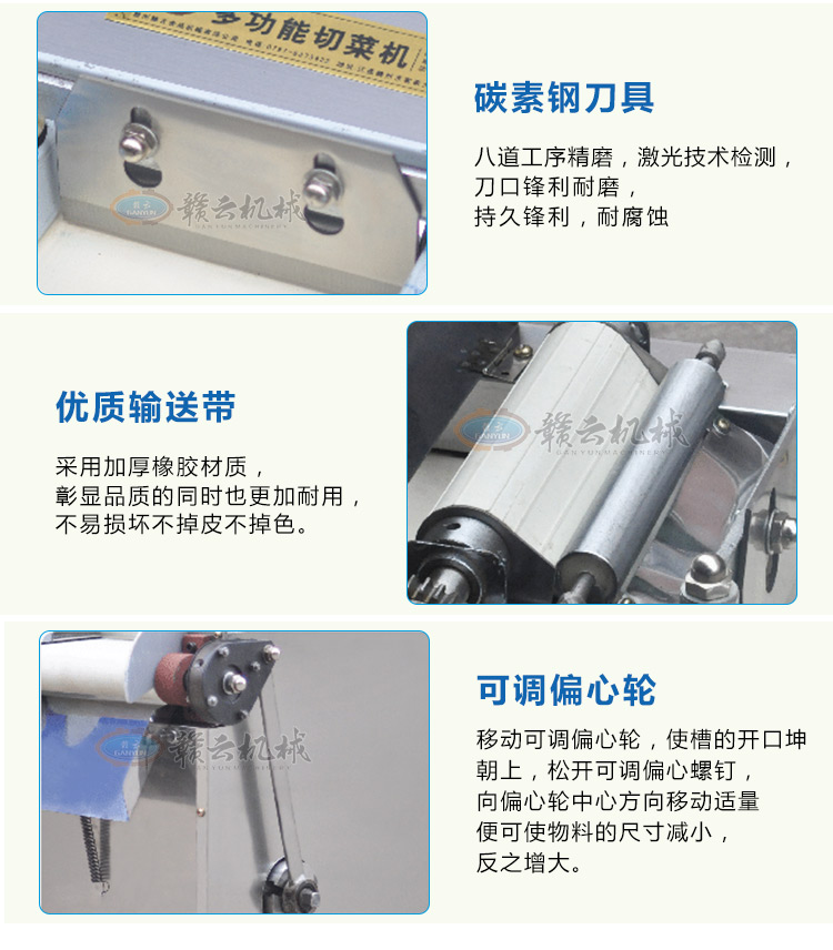 贛云牌多功能切菜機是根據多種樣機在實地使用中存在不足之處,反復改進設計制造,采用不銹鋼和全滾動軸承結構,具有外形美觀,成熟可靠,使用維修方便等特點。適用直蔬菜脫水、速凍、保鮮、腌漬等食品行業(yè)各類蔬菜。刀片距離可調節(jié)在0.1cm-2cm之間即切片、丁、絲厚薄在0.1cm-2cm。