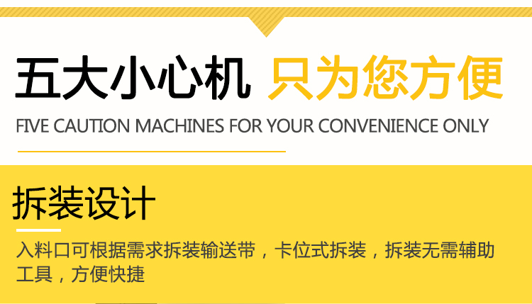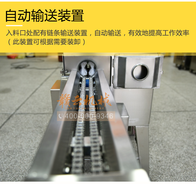 入料方便——入料口處配有鏈條進(jìn)給裝置,有效地提高了工作效率(此裝置可根據(jù)需要裝卸)。