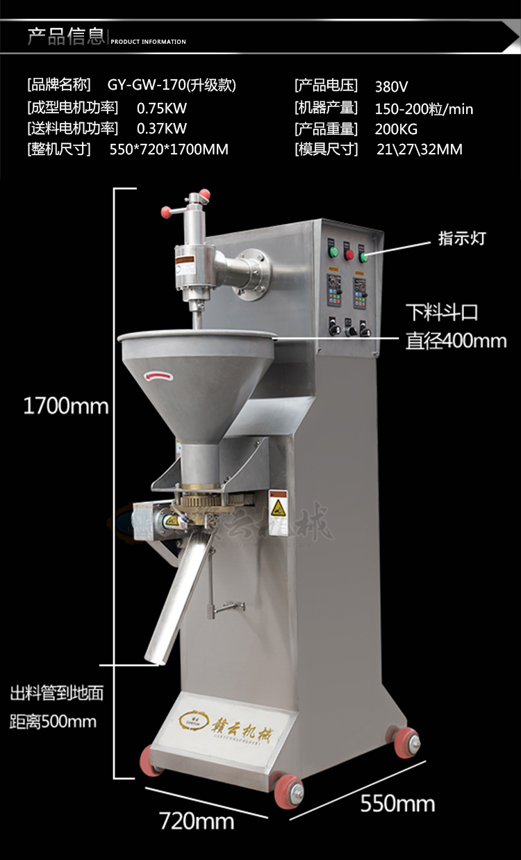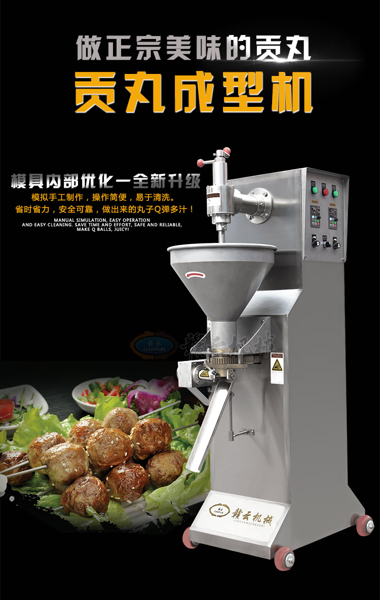 贛云牌貢丸成型機(jī)采用雙速系統(tǒng),推料和挖出成型各用一個(gè)電機(jī),挖出成型采用半球形舀勺仿人工制作,設(shè)計(jì)科學(xué)合理,采用全不銹鋼材質(zhì),符合食品衛(wèi)生加工要求貢丸大小由模具控制,每分鐘可加工成型200粒貢丸,機(jī)器的操作和清洗都很方便。隨機(jī)配成型模具:27mm、21mm和32mm。可定制18mm,34mm模具哦。