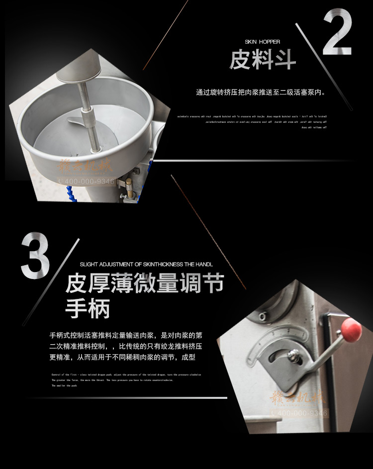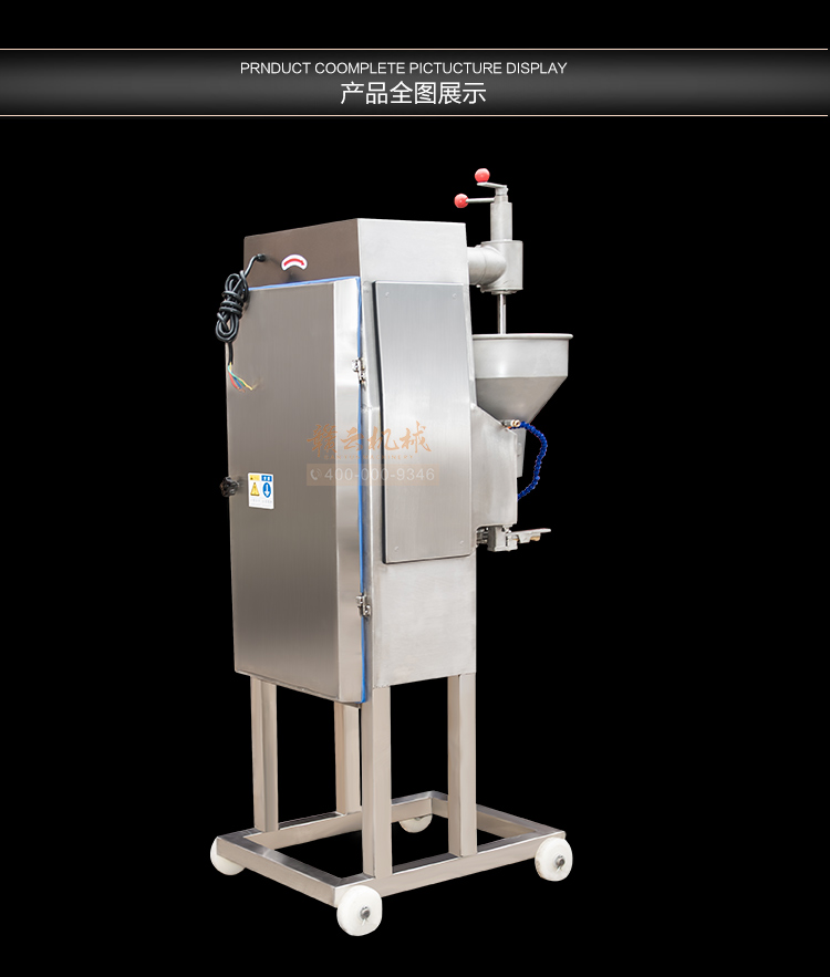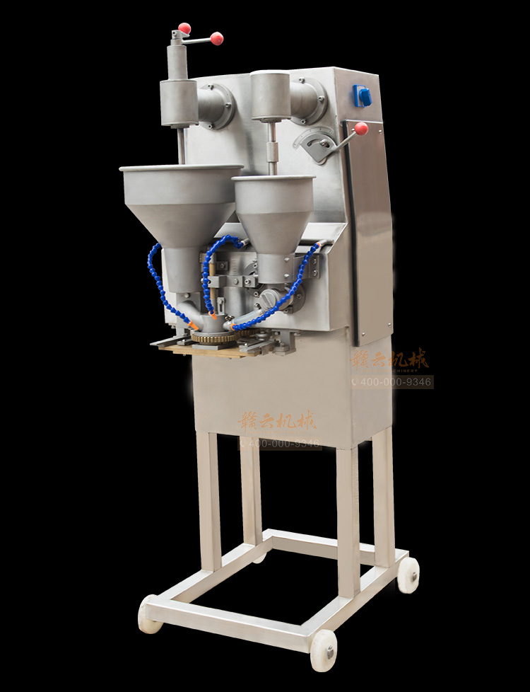 第三代包心肉丸機(jī)是在贛云二代包心肉丸機(jī)的基礎(chǔ)上,對(duì)二代包心機(jī)的成型切割部位進(jìn)行優(yōu)化提速處理,達(dá)到每分鐘200粒的成型速度是二代包心機(jī)的兩倍,且推料控制方式還是選用一級(jí)絞龍推料和二次泵定量輸送相結(jié)合的原理,餡料控制改塑料螺蓋為不銹鋼抗氧化特殊處理螺蓋,餡斗新增絞龍擋板,可有效防止肉餡余留餡斗,更易肉餡的向下擠壓輸送作用,成型旋轉(zhuǎn)齒輪上新增潤滑滴管,彌補(bǔ)了二代包心機(jī)成型區(qū)域局部潤滑切刀的缺陷,做出的包心包餡丸表皮光滑,個(gè)體圓且大,成型速度快,無小尾巴等優(yōu)勢(shì)。綜上優(yōu)勢(shì)pk二代和目前其他廠家新款式包心肉丸機(jī),故稱之為贛云第三代包心肉丸機(jī)!