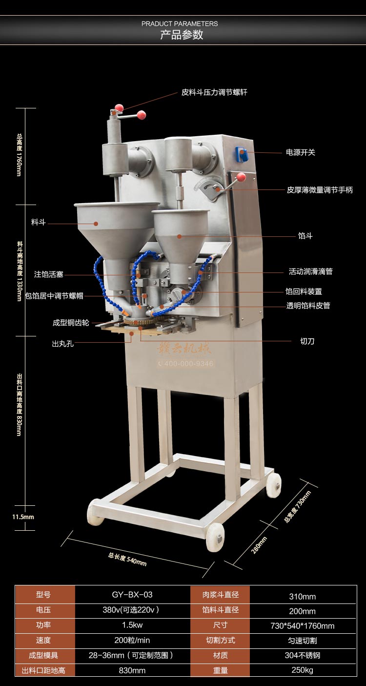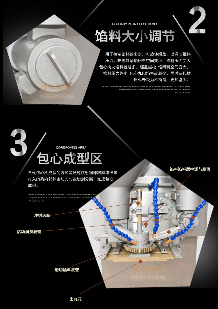 2014冬季新款包心肉丸機(jī),第三代肉丸包心機(jī)保留了二代包心機(jī)的全部優(yōu)勢(shì)外,在包心成型速度上做了本質(zhì)上的突破,每分鐘成型200粒的速度是二代包心機(jī)的兩倍,機(jī)身表面接觸食物部位升級(jí),特殊處理更耐氧化和腐蝕,由于速度上的重大突破,因而稱之為第三代包心肉丸機(jī)。