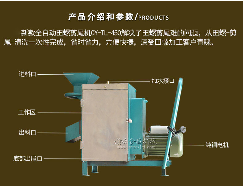新款全自動田螺剪尾機GY-TL-450解決了田螺剪尾難的問題,從田螺-剪尾-清洗一次性完成,省時省力,方便快捷,深受田螺加工客戶青睞。