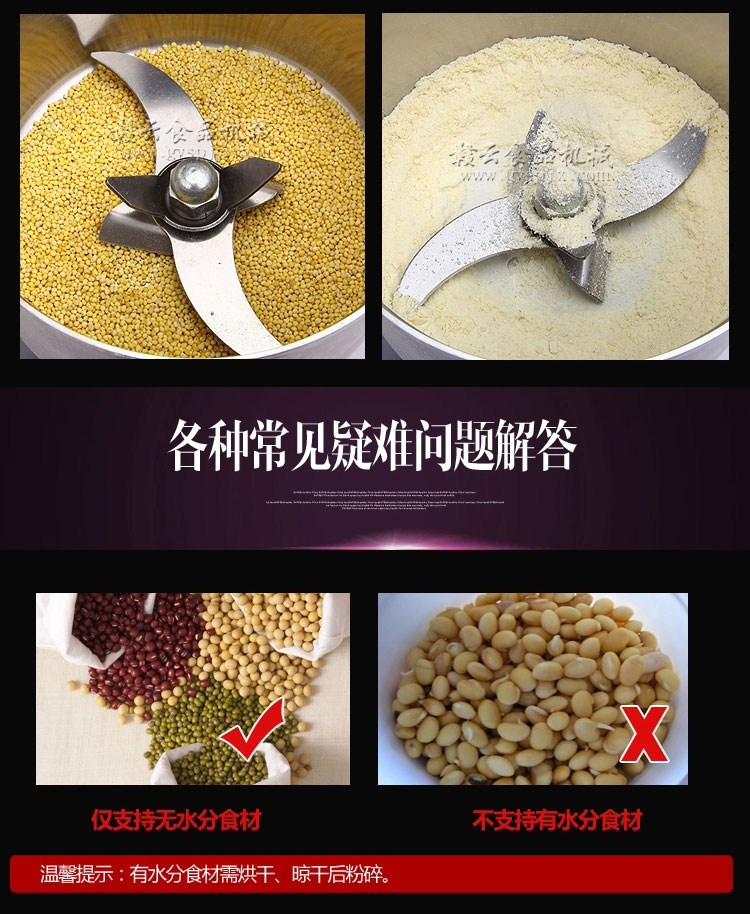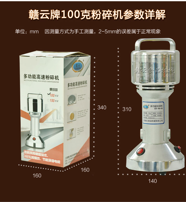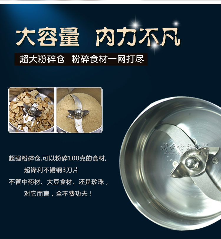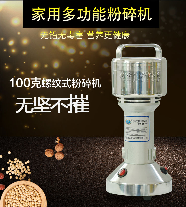 贛云系列多功能粉碎機采用純銅高速電機帶動粉碎刀片將物料快速打成粉末,可用于粉碎五谷、雜糧、田七、阿膠、白叁等,一般粉碎時間1-2分鐘即可,新款粉碎機改保險絲為空氣過載保護器,使用更安全,我廠提供的粉碎機有100克-1000克不同型號的多功能粉碎機。