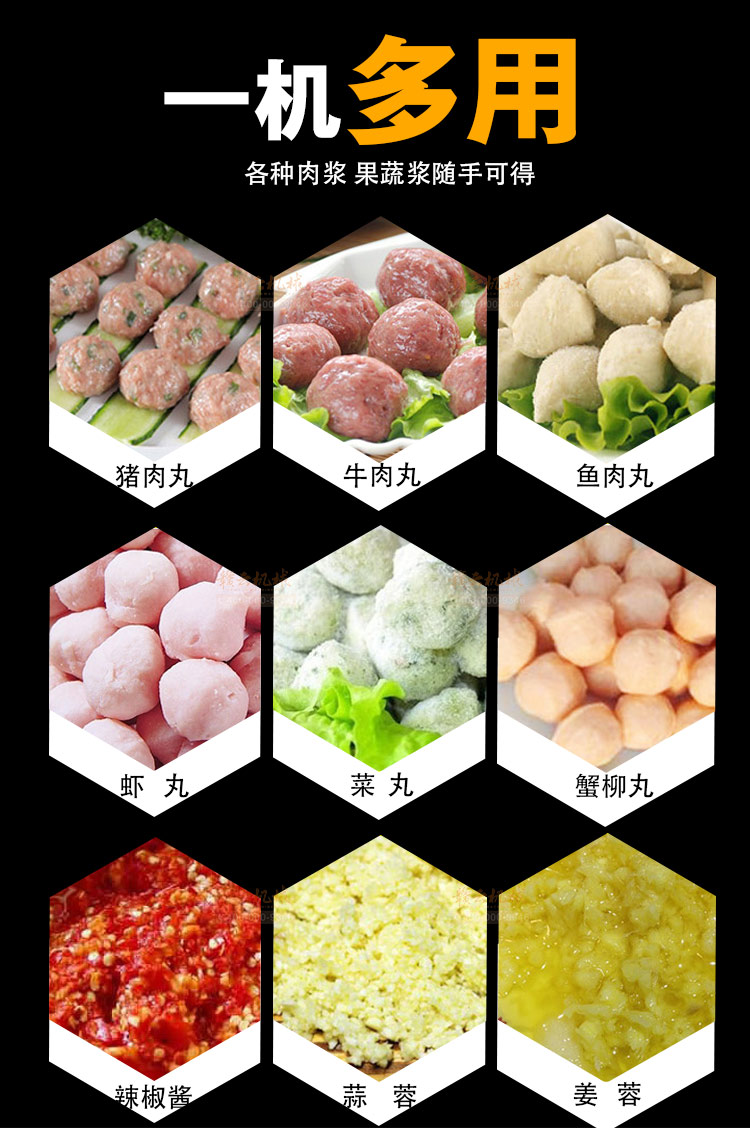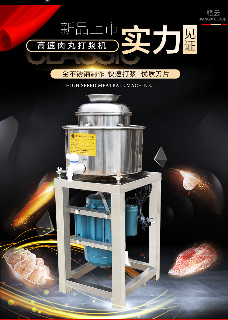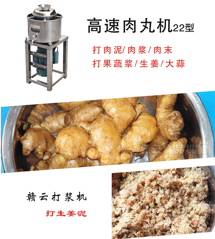 贛云牌新款全不銹鋼肉丸機(jī),22型肉丸機(jī)采用全不銹鋼材質(zhì),在舊款全不銹鋼肉丸機(jī)的基礎(chǔ)上給支撐架加粗加厚,用不銹鋼蓋,打漿雙桶,刀柄刀片均采用不銹鋼材質(zhì)。打漿桶裝肉量2l,一次可打肉漿4斤左右,采用2800r/min高速電機(jī),故稱之為高速肉丸機(jī)。
