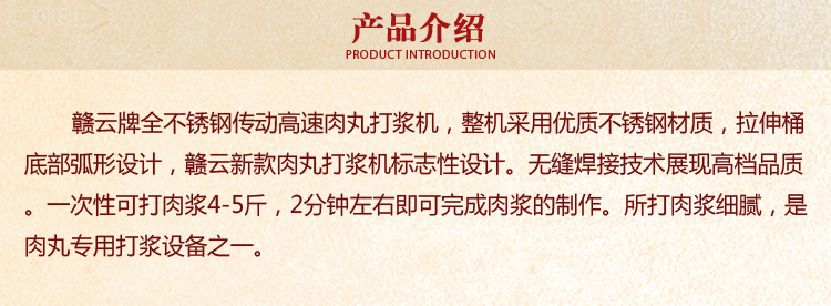 贛云牌全不銹鋼傳動高速肉丸打漿機,整機采用優(yōu)質(zhì)不銹鋼材質(zhì),拉伸桶底部弧形設(shè)計,贛云新款肉丸打漿機標(biāo)志性設(shè)計。無縫焊接技術(shù)展現(xiàn)高檔品質(zhì)。一次性可打肉漿4-5斤,2分鐘左右即可完成肉漿的制作。所打肉漿細(xì)膩,是肉丸專用打漿設(shè)備之一。