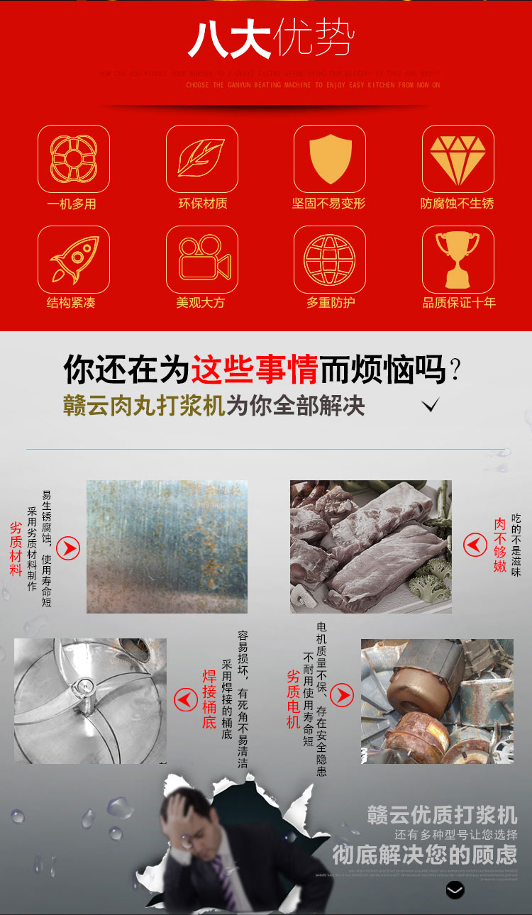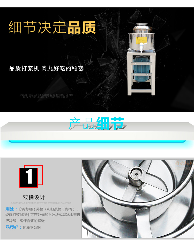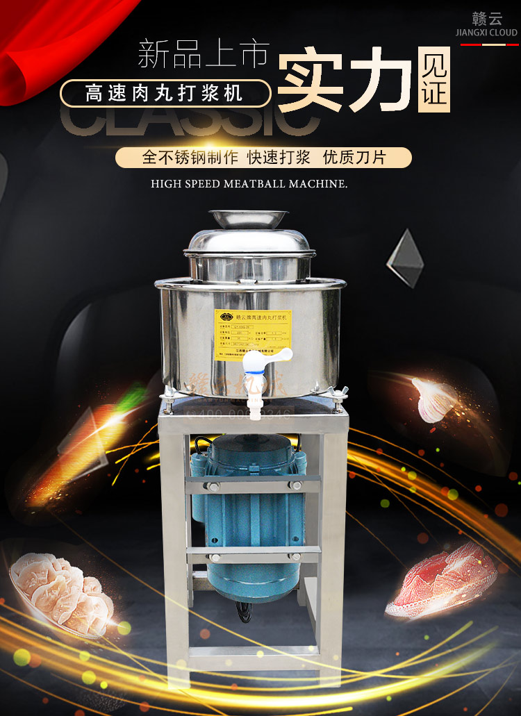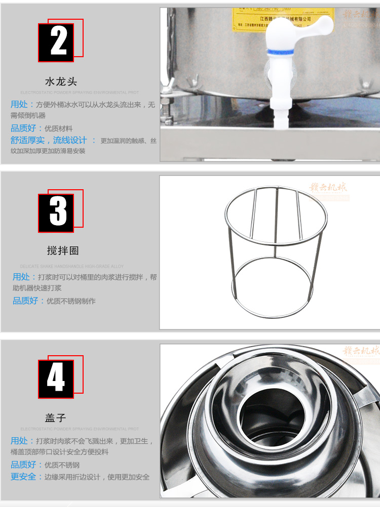 贛云牌肉丸打漿機采用全不銹鋼材質(zhì),默認配用1.5kw國標銅線贛云牌電動機,打漿刀片和刀架、攪拌圈、蓋子、支持架、打漿雙桶、軸承、螺絲均采用不銹鋼材質(zhì),是正真意義上全不銹鋼