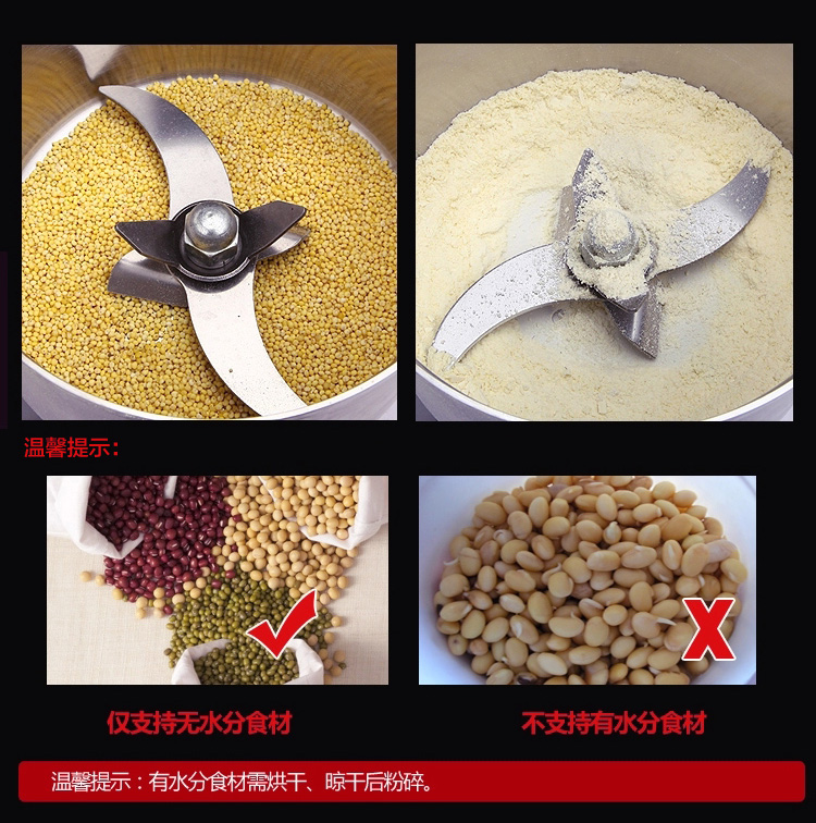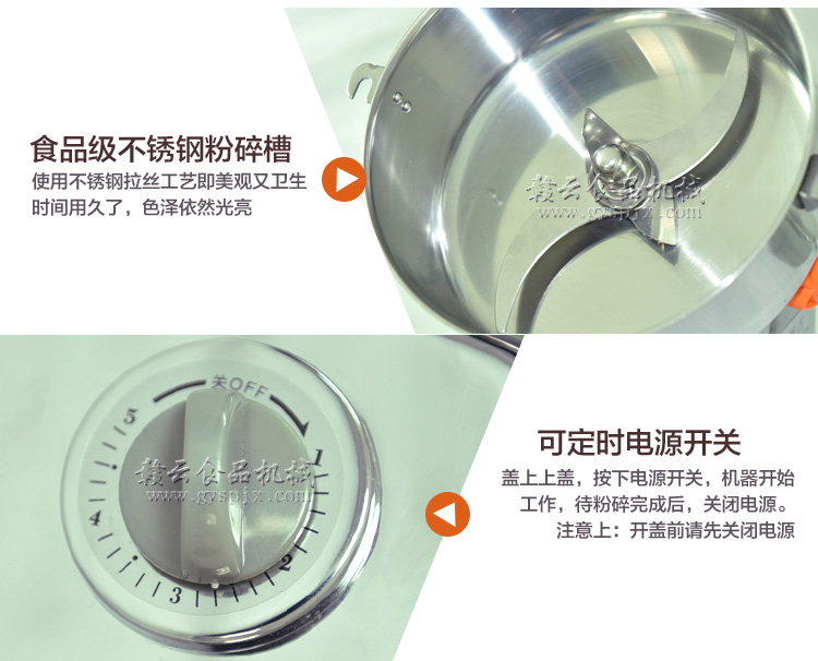 贛云系列多功能粉碎機(jī)采用純銅高速電機(jī)帶動(dòng)粉碎刀片將物料快速打成粉末,可用于粉碎五谷、雜糧、田七、阿膠、白叁等,一般粉碎時(shí)間1-2分鐘即可,新款粉碎機(jī)改保險(xiǎn)絲為空氣過載保護(hù)器,使用更安全,我廠提供的粉碎機(jī)有100克-1000克不同型號(hào)的多功能粉碎機(jī)。