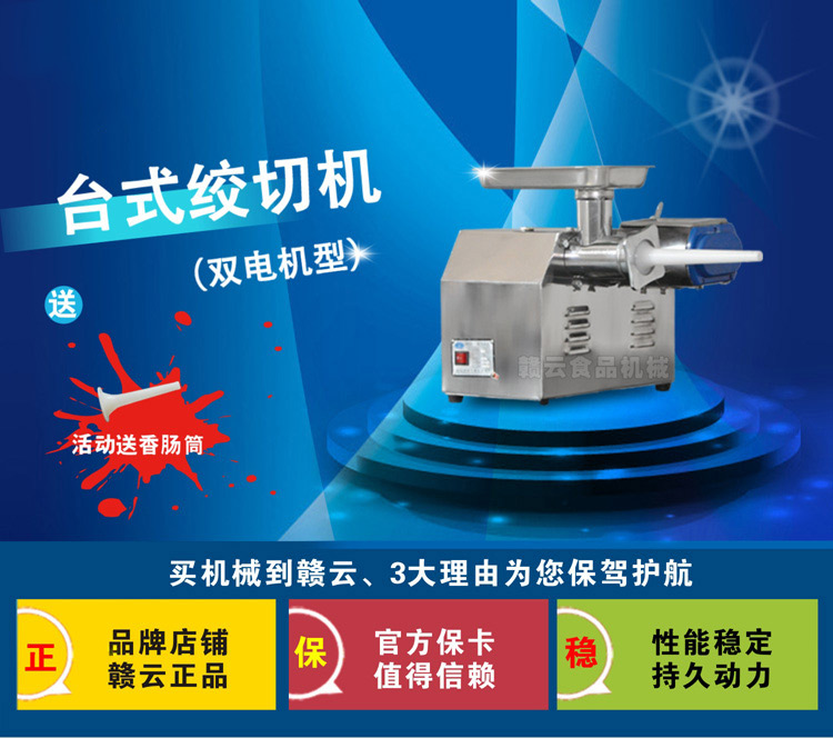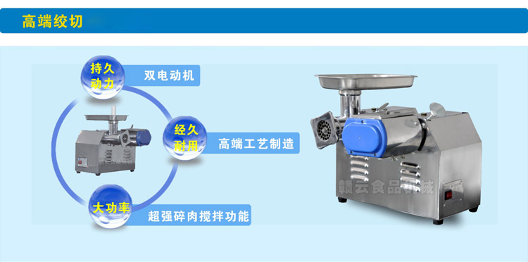 臺式絞切機(jī)雙電機(jī)是贛云推出12型臺式絞切機(jī)之后的又一款新品之作,采用不銹鋼板材將兩臺機(jī)器封裝在一個機(jī)身之中,絞肉機(jī)頭和切肉機(jī)頭因不屬于同一電動機(jī)控制,可分開工作,亦可同時工作,采用不同開關(guān)控制,操作更方便。
