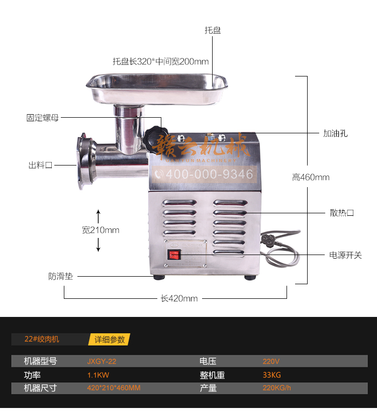 這款22型臺式不銹鋼絞肉機(jī),采用平滑帶槽三通升級,融合不銹鋼絞龍設(shè)計,外觀設(shè)置更顯檔次,散熱性能更好,體積更大!時絞肉量220kg