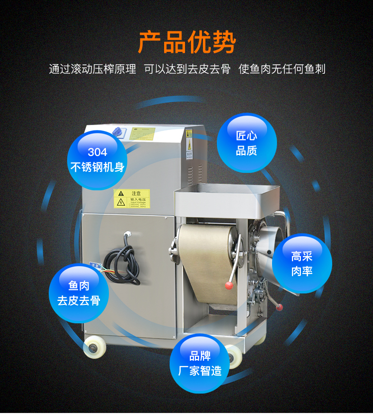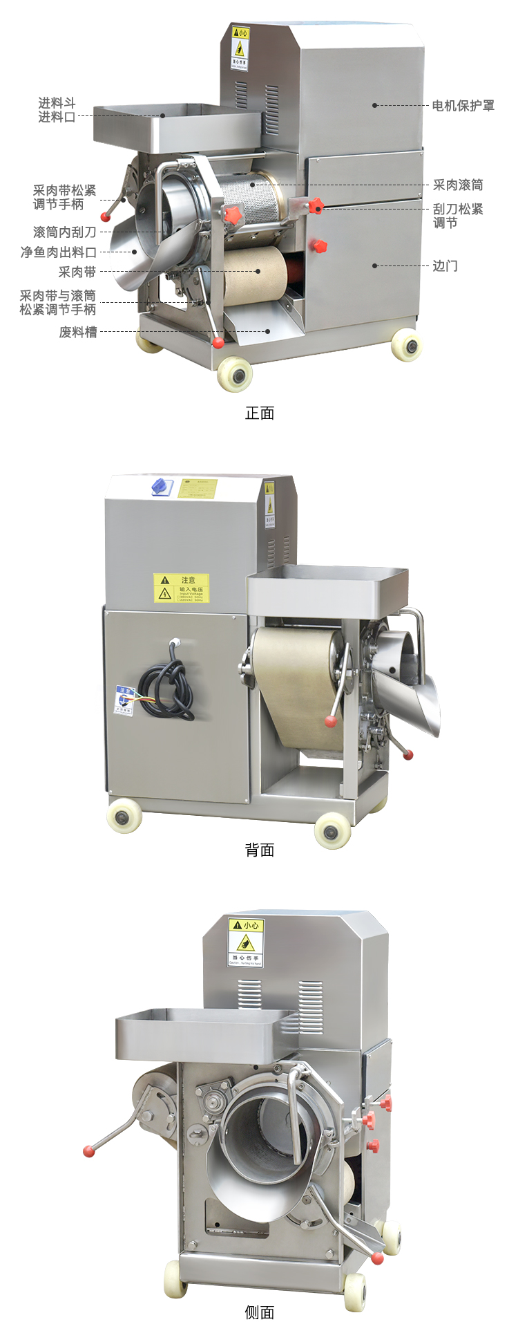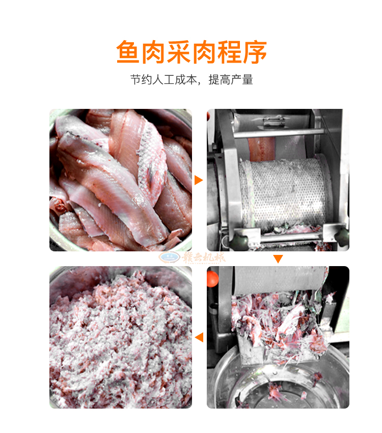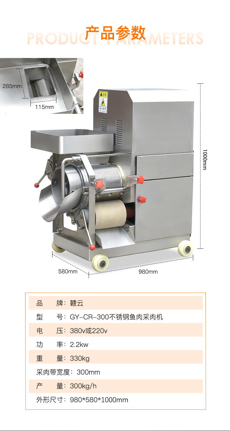 贛云系列不銹鋼300型魚肉采肉機(jī)又稱為去魚骨機(jī),采用擠壓原理將魚肉跟魚皮和魚骨分離開來,達(dá)到采魚肉的作用,這樣分離出來的魚肉含魚骨較少,還含有少量的魚筋、魚血等雜物,一般可使用魚糜精濾機(jī)過濾一遍,可使魚肉色純,魚肉更細(xì)膩,生產(chǎn)高品質(zhì)魚糜制品。