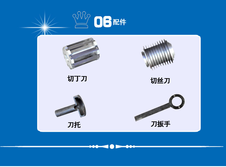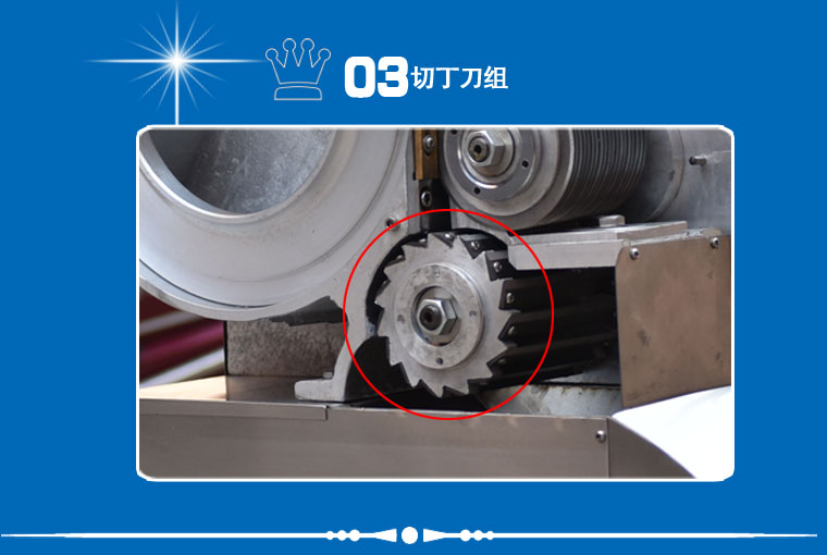 工作原理:GY-DQ-130型切丁機(jī)通過旋轉(zhuǎn)撥盤將被切物體帶動(dòng)高速旋轉(zhuǎn),利用物體的離心力,立刀將物體切成片狀,然后經(jīng)過圓盤切絲刀片豎切成條狀,并將條狀物送入橫切斷刀口,由橫切斷刀盤切刀切成所需的長(zhǎng)方體或立方體。