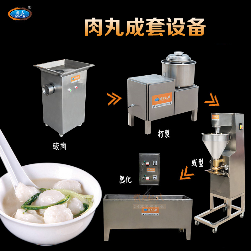 贛云2016新推出實(shí)用實(shí)心豬肉丸成套設(shè)備,本套設(shè)備采用:32B型不銹鋼強(qiáng)力絞肉機(jī)、28B型全封閉高速肉丸打漿機(jī)、160型加高肉丸成型機(jī)和1500型智能溫控雙加熱水槽。詳細(xì)參數(shù)如下