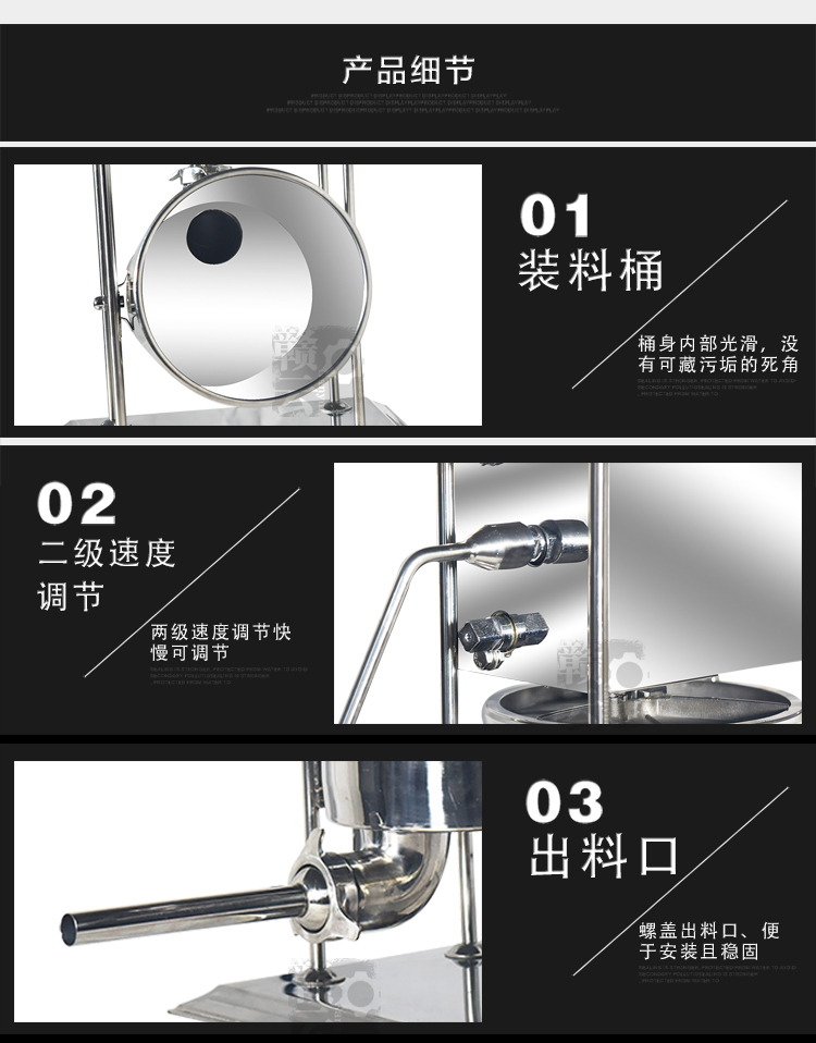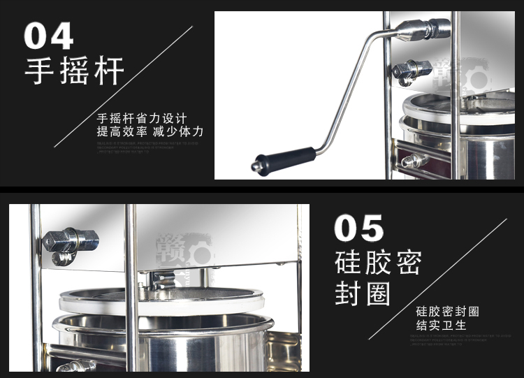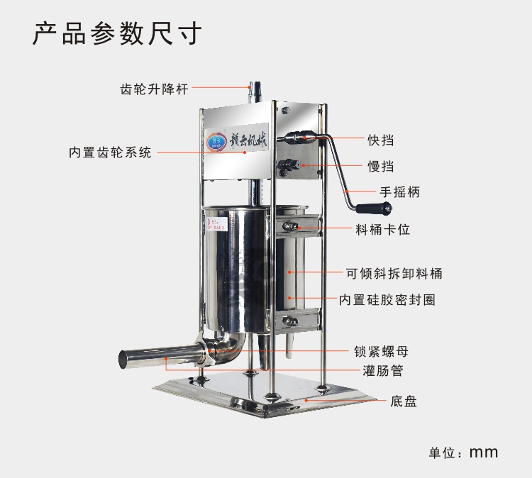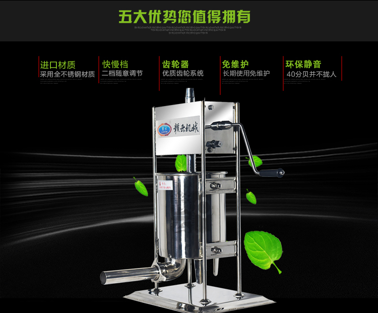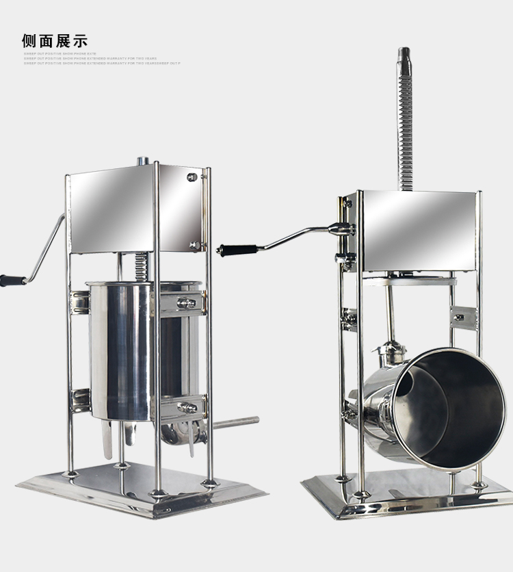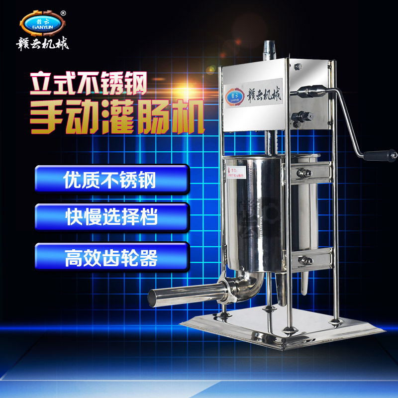贛云牌立式不銹鋼手搖灌腸機(jī),專業(yè)灌制各種腸類(lèi),如臘腸、香腸、火腿腸、親親腸。整機(jī)采用全齒輪優(yōu)質(zhì)拉桿升降系統(tǒng)設(shè)計(jì),液壓式灌腸,并兩檔速度可調(diào),并有效利用了機(jī)械杠桿省力原理,讓你灌腸輕松自在,灌腸完畢之后還可放心全身水洗,裝料桶亦可方便拆卸,便于清洗。