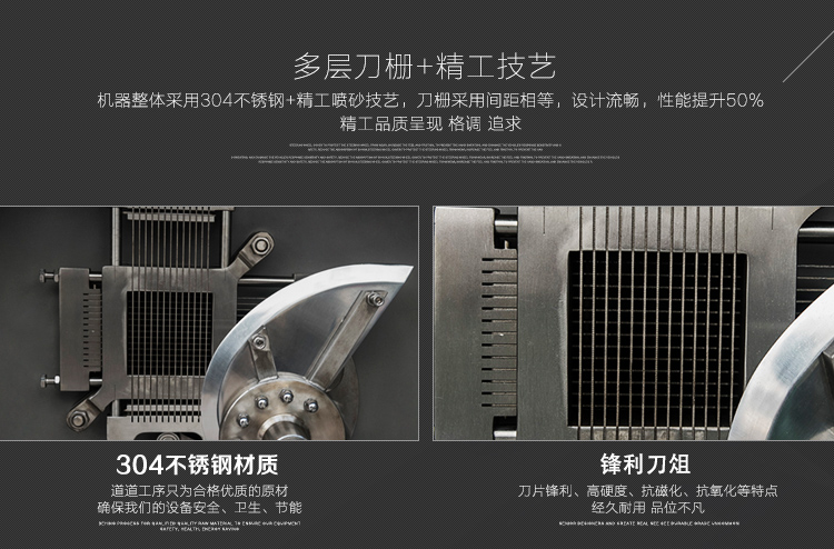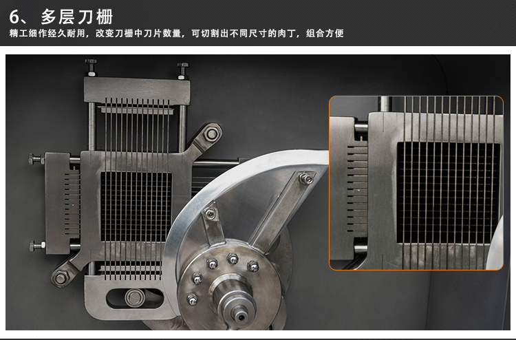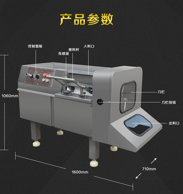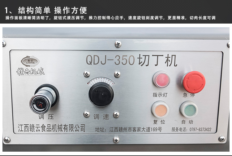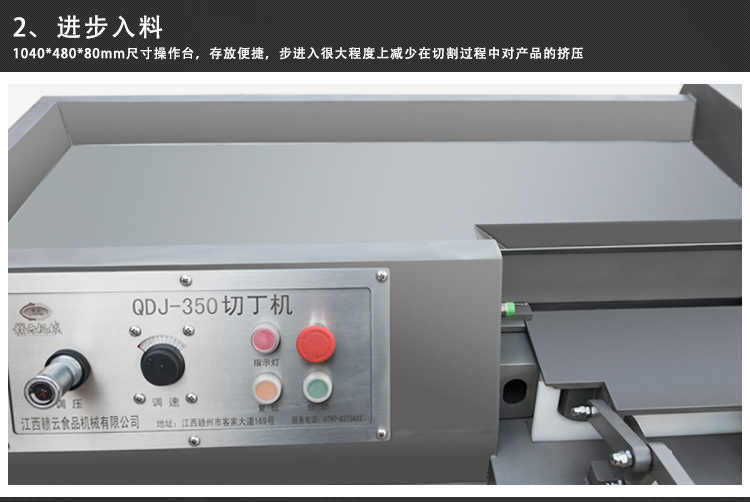贛云350型切肉丁機(jī),采用304不銹鋼噴砂處理技術(shù),裝備優(yōu)質(zhì)刀組,利用流水線條設(shè)計(jì),配合激光雕刻控制面板,整體外形美觀大氣。液壓步進(jìn)式推料自動(dòng)切割,推料速度旋鈕可調(diào),拆增刀片可切出多種規(guī)格肉丁、肉條、肉片。是肉類食品加工切丁專用設(shè)備。