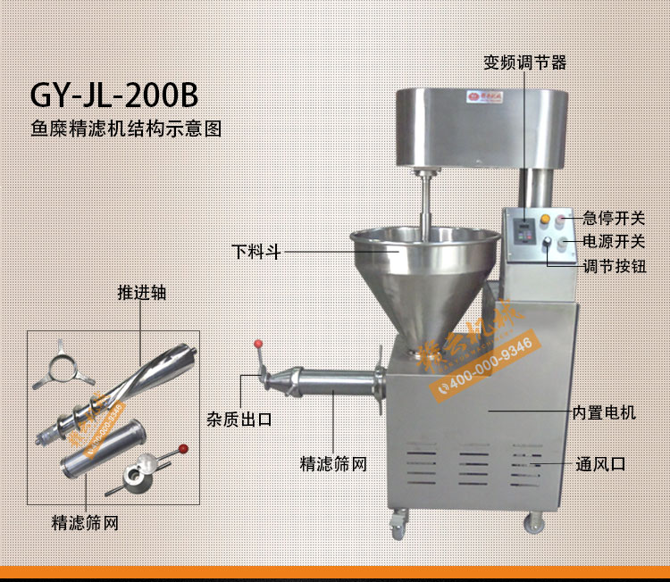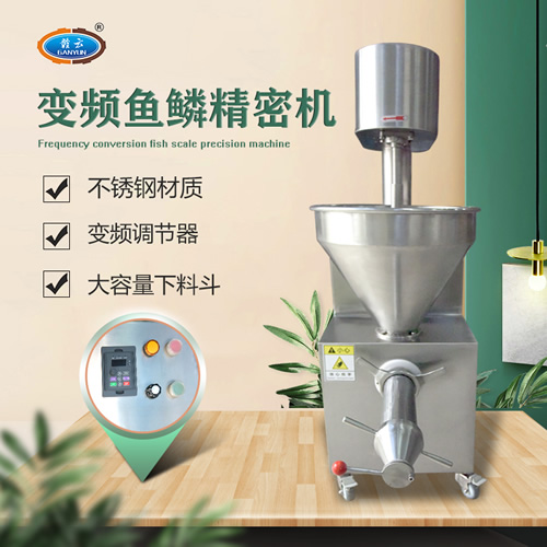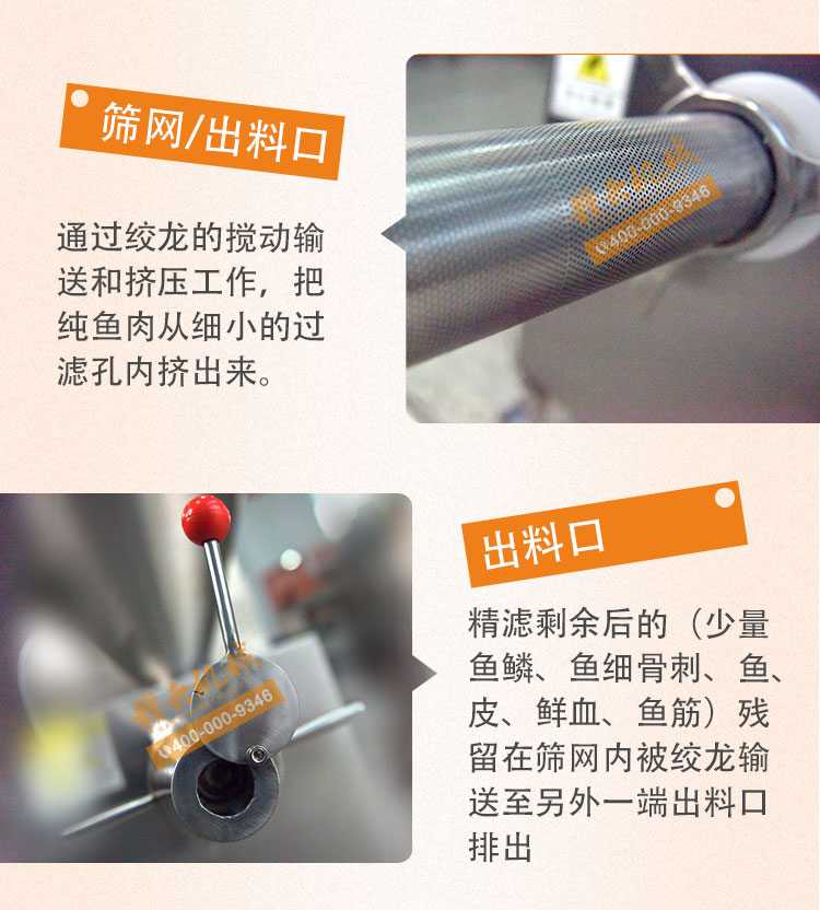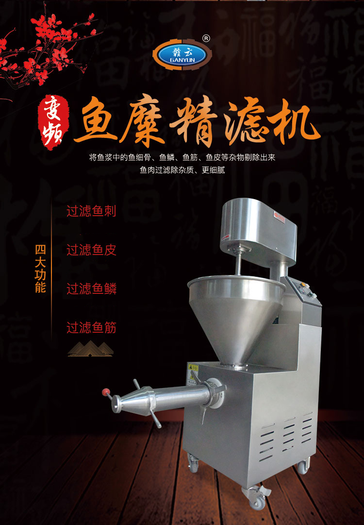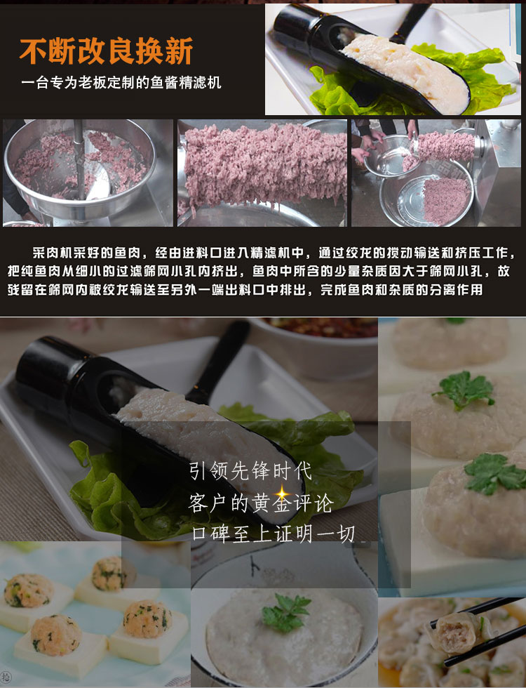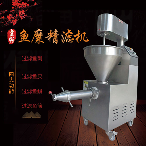 魚糜魚肉精濾機(jī),商用變頻自動化過濾魚肉魚刺魚骨機(jī),魚肉雜質(zhì)過濾機(jī)可對魚肉采肉機(jī)采出來的肉進(jìn)行進(jìn)一步精濾,去除殘余魚鱗,魚筋,魚皮,魚血等雜質(zhì),在加工高端魚丸、魚豆腐、魚餅這些對肉質(zhì)要求高的魚類制品,需要經(jīng)過此款精濾機(jī)再過濾,是魚糜加工生產(chǎn)設(shè)備。 先經(jīng)過采肉機(jī)將采好的魚肉,在經(jīng)由進(jìn)料口進(jìn)入精濾機(jī)中,通過絞龍的攪動輸送和擠壓工作,把純魚肉從細(xì)小的過濾篩網(wǎng)小孔內(nèi)擠出,魚肉中所含的少量雜質(zhì)因大于篩網(wǎng)小孔,故殘留在篩網(wǎng)內(nèi)被絞龍輸送至另外一端出料口中排出,完成魚肉和雜質(zhì)的分離作用
