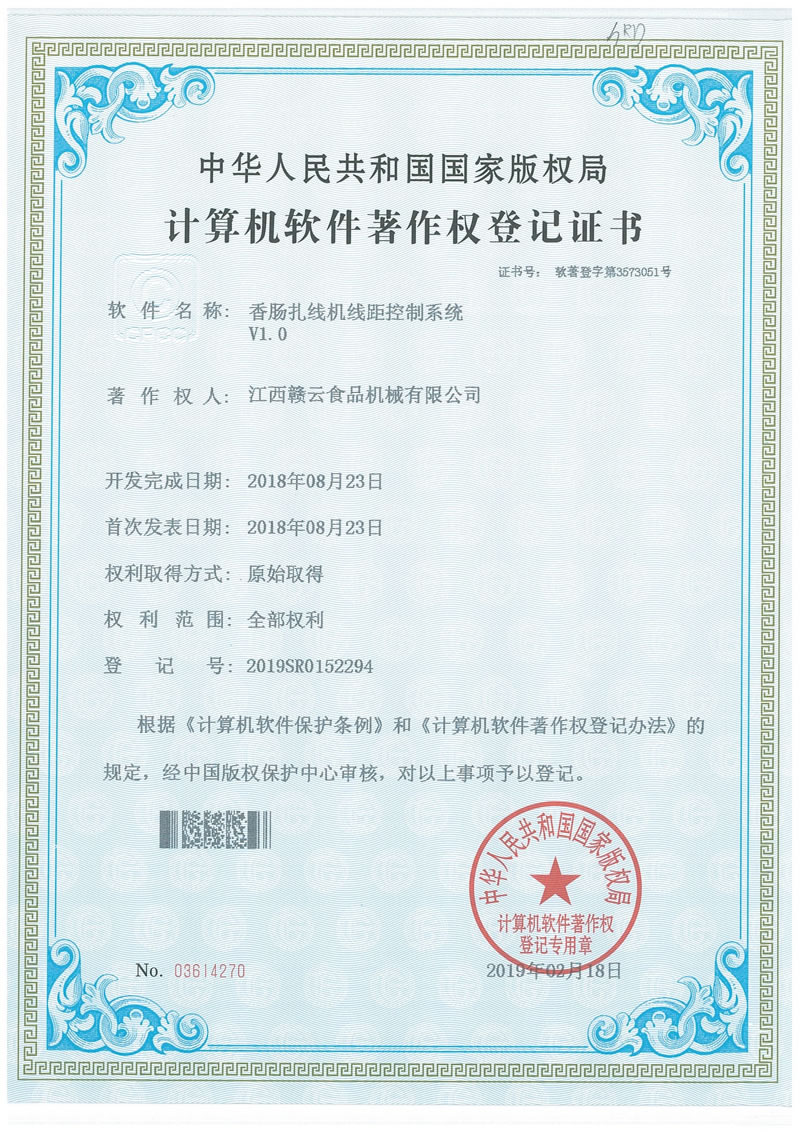 計算機軟件著作權登記證書(香腸扎線機線距控制系統)