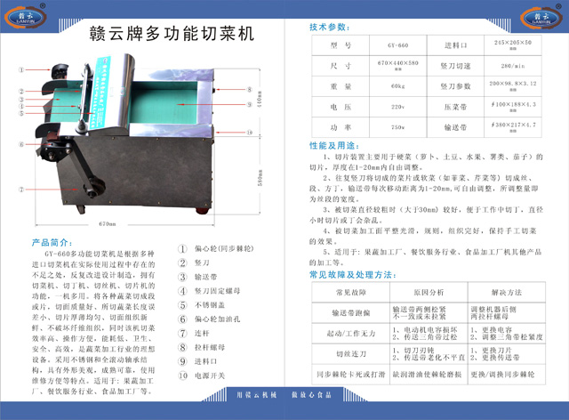 適用范圍:用于片、段、絲、條、丁等產(chǎn)品。如各種塊莖、葉菜、海帶等。也可切圓形如土豆、蘿卜等產(chǎn)品。 該機(jī)可將根、莖、葉等蔬菜加工成片、絲、丁、菱、片等,適用于醬菜加工廠及大型食堂、飯店等場所使用;