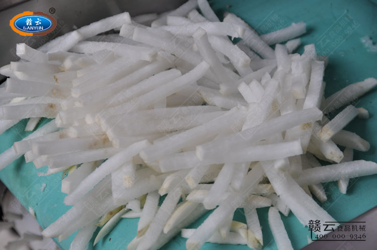 贛州市贛云食品機(jī)械廠專業(yè)生產(chǎn)銷售切菜機(jī)、切丁機(jī)、切條機(jī)、切片機(jī)等多功能系列切菜設(shè)備,山東客戶定做1000B型切菜機(jī)切蘿卜條,定做8mm切條刀具試機(jī)效果展示圖片賞析,菜場(chǎng)購(gòu)買的大白蘿卜,最大直徑約90mm,切出來(lái)的蘿卜條規(guī)格為8*8*90mm,以下是本次試機(jī)實(shí)際效果圖片賞析: