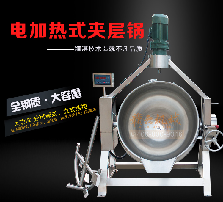 電加熱夾層鍋采用全鋼材質(zhì),304不銹鋼鍋,安全衛(wèi)生,雙加熱按鈕控制,定時(shí)溫控帶攪拌功能。200L大容量