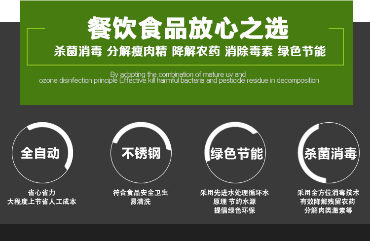 氣泡水循環(huán)臭氧洗菜機(jī),殺菌消毒,強力清洗,節(jié)約80%以上用水,采用沖擊波原理,能自動將摘好的瓜果、蔬菜、肉類等食品表面清洗干凈,提高50%以上的工作效率,殺菌消毒采用紫外線和臭氧結(jié)合,有效殺滅有害細(xì)菌和分解農(nóng)藥殘留。密集活氧發(fā)布點 360度情急無死角。