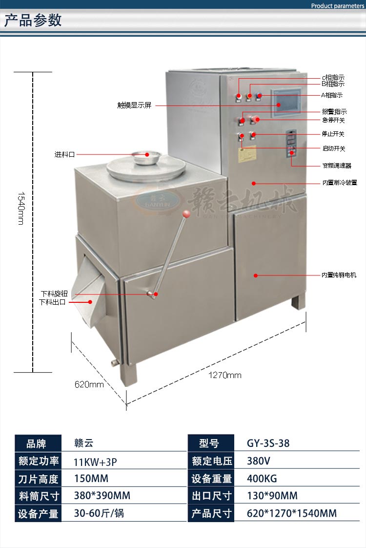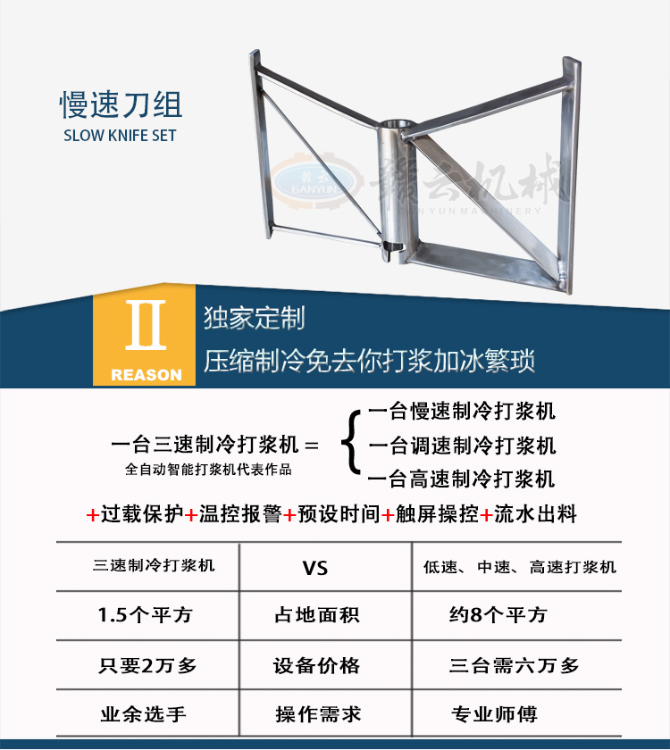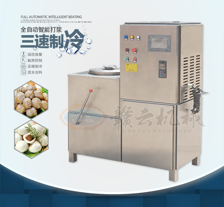 贛云三速制冷打漿機(jī),采用智能操控系統(tǒng) ,根據(jù)原料的不同選擇不同的速度進(jìn)行打漿,三種速度配備三種刀組,分別是高速打漿刀,中速打漿刀和低速打漿刀。三機(jī)合一不僅占地面積小,集可視化觸屏操作、預(yù)設(shè)打漿時(shí)間、溫控感應(yīng)系統(tǒng)、超負(fù)荷停機(jī)報(bào)警系統(tǒng)、流水式搖桿控制出料,并配備大功率的壓縮制冷系統(tǒng),效果快速,十分鐘就能達(dá)到想要的制冷效果,很好的保證了肉漿的鮮度。