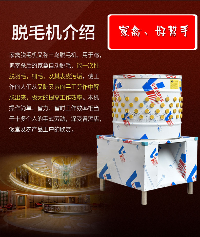 燒鴨自古以來就是很美味的一道菜,聰明的古代人在吃方面也有所研究,燒鴨這道美味的菜肴就是聰明的古代人的研究成果,很久以前在嶺南地區(qū)就流傳著這樣一句話:廣州吃燒鵝,南寧吃燒鴨。南寧人自古喜歡吃鴨,這和南寧的氣候有極大關(guān)系。南寧天氣炎熱,居住于此的南寧先民認為鴨肉清熱祛火,而鵝肉性毒,吃了會使患處愈加發(fā)炎腫脹,多食上火生瘡。據(jù)說,南寧最早出現(xiàn)燒鴨是在清初康熙年間。南寧燒鴨的原料多選用南寧本地的芝麻鴨,皮香肉嫩,骨頭帶香。由于地域不同,形成了選料、制作流程、吃法等風(fēng)格的迥異,南寧燒鴨與北京烤鴨代表了中國烤鴨的南北兩派別,但是鴨子固然好吃,但是鴨毛缺很難處理,現(xiàn)在由小編為為您推薦一款現(xiàn)在食品加工中最為受歡迎的一款雞鴨鵝脫毛機器, 為您解決雞鴨鵝脫脫毛的問題。贛云牌家禽全自動脫毛機可供廣大禽加工專業(yè)戶,烤雞、烤鴨、飯店、餐館、學(xué)校、食堂、酒店、菜場等使用,操作過程中具有操作簡單,省力、省時,衛(wèi)生等優(yōu)點,推薦的這款脫雞鴨毛的機器外觀選用了全不銹鋼結(jié)構(gòu),內(nèi)置脫毛棒,這款全自動家禽褪毛機脫出的家禽都非常的干凈,脫凈率高達了98%,我們更是專業(yè)生產(chǎn)加工廠雞鴨脫毛機的,所以選擇我們贛云將是您不錯的選擇。