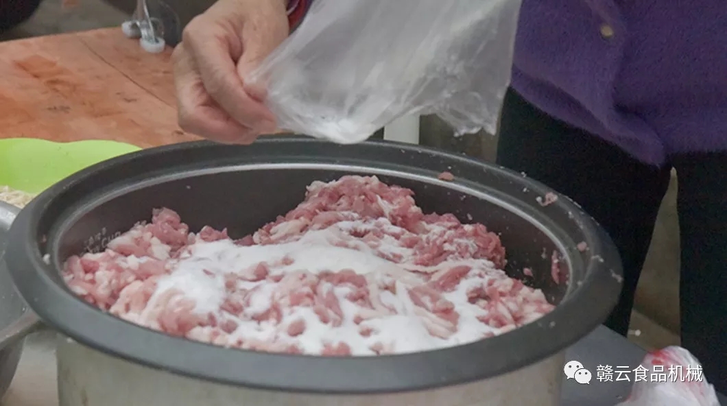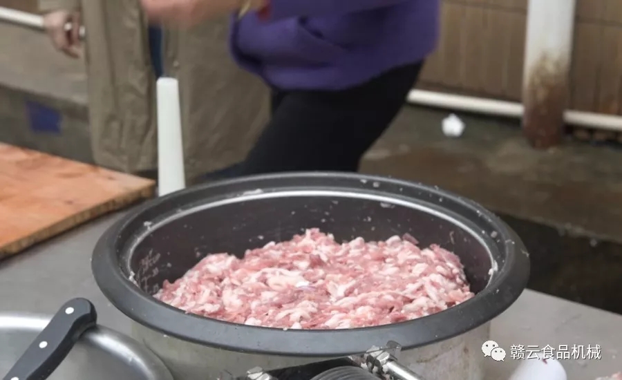特別提示:拌制時要控制攪拌質(zhì)量,加大原料肉和調(diào)料的混合攪拌,確保調(diào)料和原料肉拌制均勻,避免灌腸前原料肉上仍有調(diào)料干結(jié)小結(jié)塊。