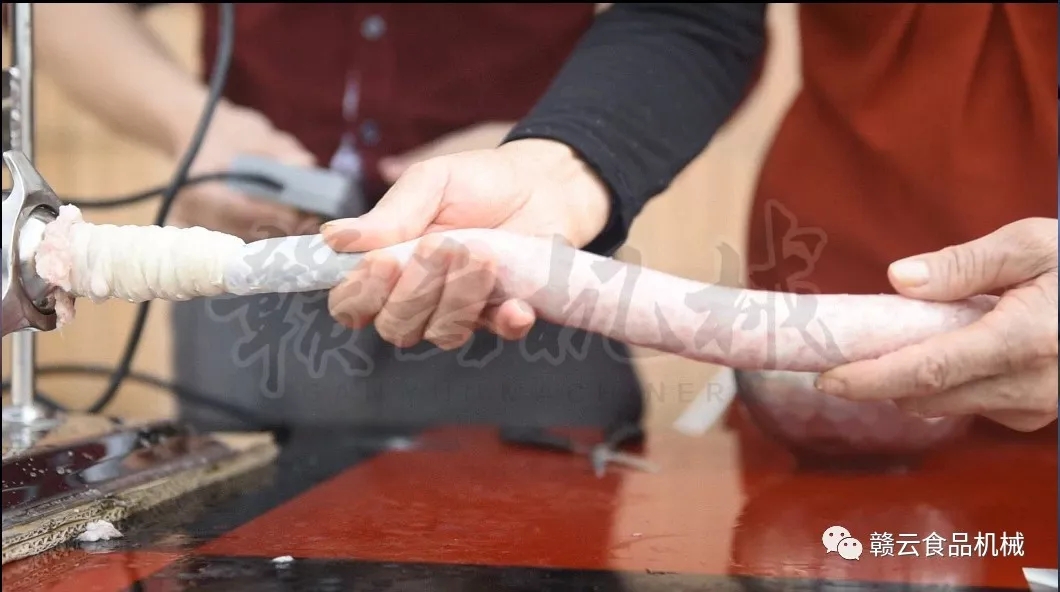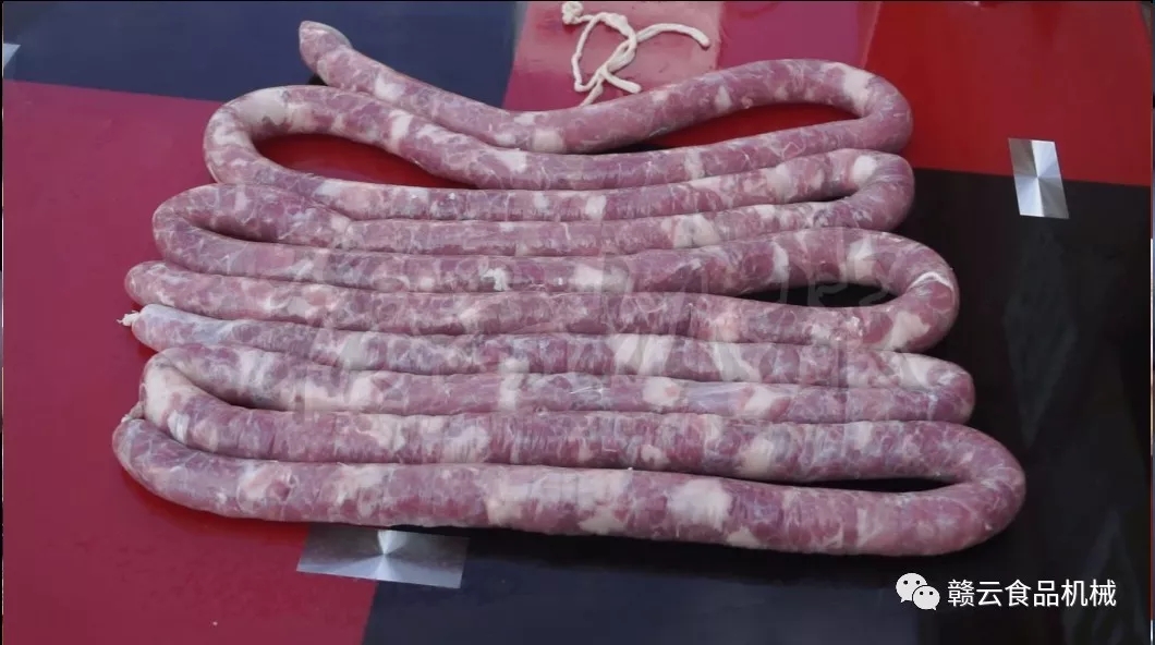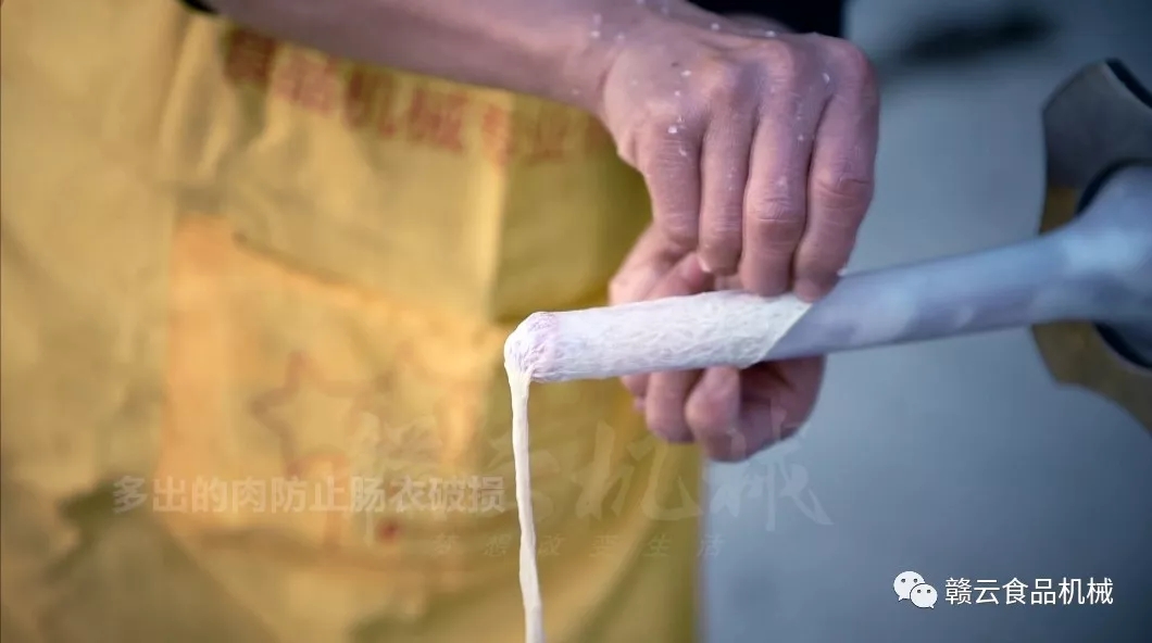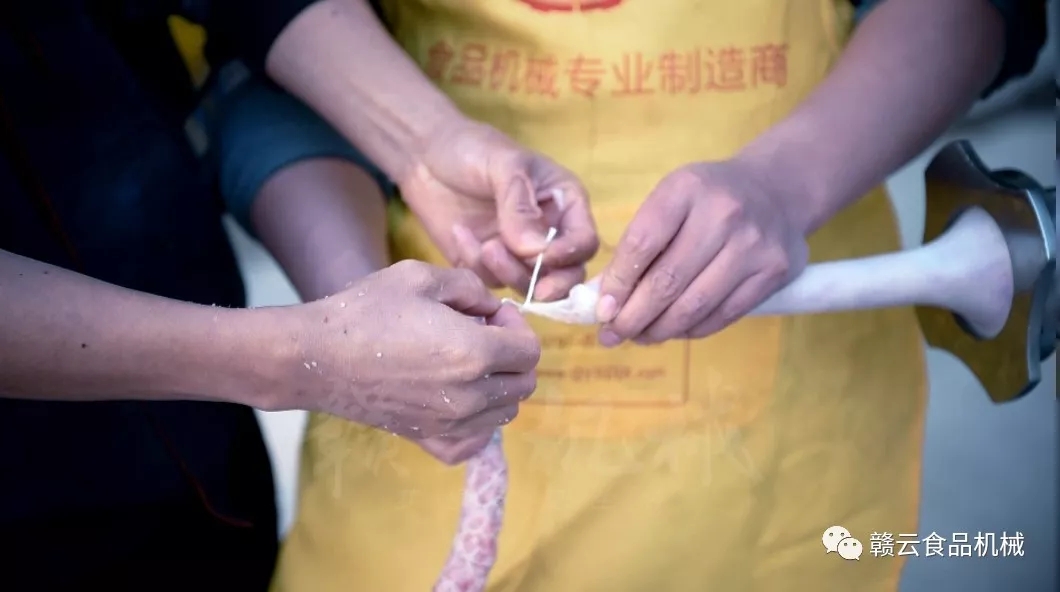 ③當出現(xiàn)腸衣破損時,要將其從破損處切掉扎口,將溢出的肉放入機器重新灌制;